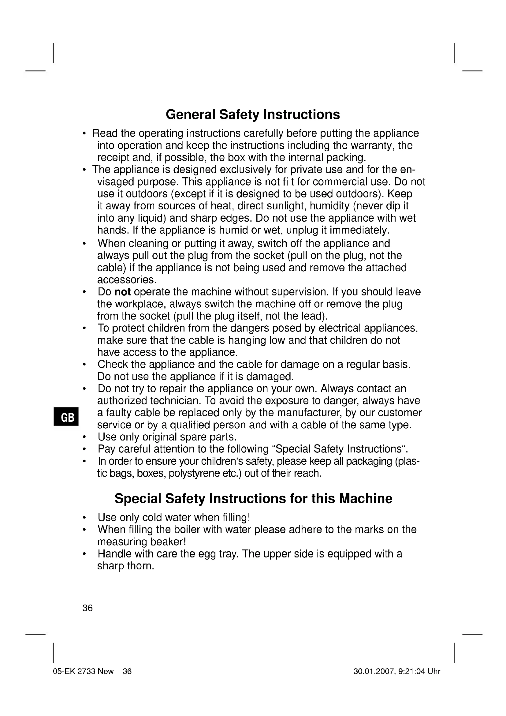 - Do not use vinegar, but a normal citric acid-based decalcifi er. Follow the manufacturers’ instructions! Technical Data Model: ........................................................................................EK 2733 Power supply: .......................................................................230 V, 50 Hz Power consumption:.......................................................................350 W Protection class: ......................................................................................Ι This device has been tested according to all relevant current CE guide- lines, such as electromagnetic compatibility and low voltage directives, and has been constructed in accordance with the latest safety regulati- ons. Subject to technical changes without prior notice! Guarantee The device supplied by our Company is covered by a 24 month guaran- tee starting on the date of purchase (receipt). During the life of the guarantee any fault of the device or its accessories ascribable to material or manufacturing defects will be eliminated free of charge by repairing or, at our discretion, by replacing it. The guaran- tee services do not entail an extension of the life of the guarantee nor do they give rise to any right to a new guarantee! Proof of the guarantee is provided by the proof of purchase. Without proof of purchase no free replacement or repair will be carried out. 05-EK 2733 New 38 30.01.2007, 9:21:05 UhrGB