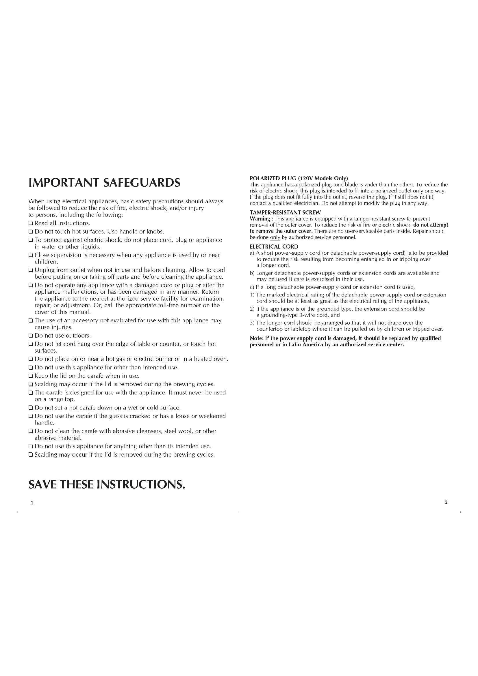 Scalding may occur if the lid is removed during the brewing cycles. SAVE THESE INSTRUCTIONS. POLARIZED PLUG (120V Models Only) This appliance has a polarized plug (one blade is wider than the other). To reduce the risk of electric shock, this plug is intended to fit into a polarized outlet only one way. If the plug does not fit fully into the outlet, reverse the plug. If it still does not fit, contact a qualified electrician. Do not attempt to modify the plug in any way. TAMPER-RESISTANT SCREW