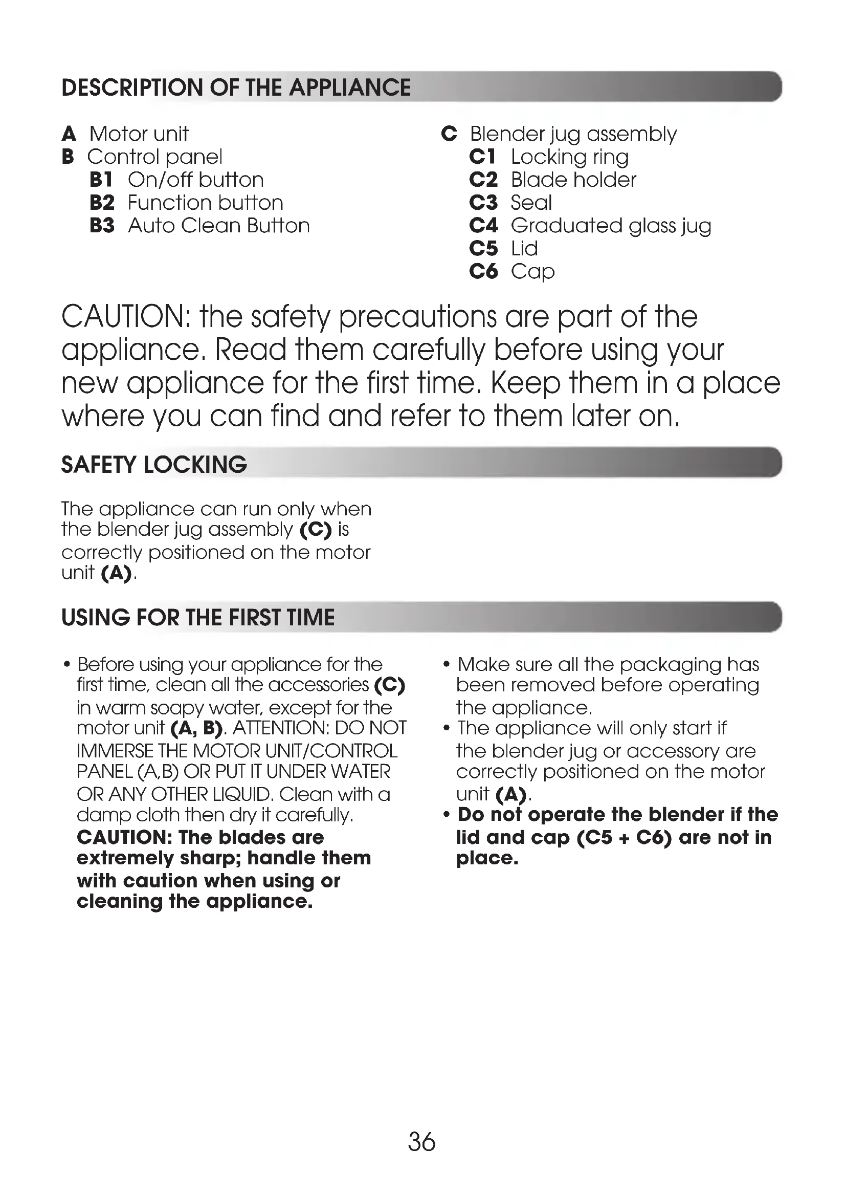 A Motor unit B Control panel B1 On/off button B2 Function button B3 Auto Clean Button C Blender jug assembly C1 Locking ring C2 Blade holder C3 Seal C4 Graduated glass jug C5 Lid C6 Cap The appliance can run only when the blender jug assembly (C) is correctly positioned on the motor unit (A). CAUTION: the safety precautions are part of the appliance. Read them carefully before using your new appliance for the first time. Keep them in a place where you can find and refer to them later on.