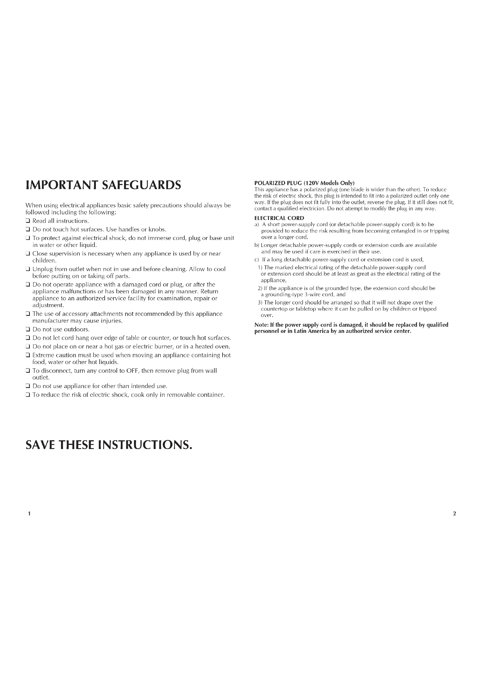To reduce the risk of electric shock, cook only in removable container. IMPORTANTSAFEGUARDS SAVETHESEINSTRUCTIONS. POLARIZEDPLUG(120VModelsOnly) This appliance has a polarized plug (one blade is wider than the other). To reduce the risk of electric shock, this plug is intended to fit into a polarized outlet only one way. If the plug does not fit fully into the outlet, reverse the plug. If it still does not fit, contact a qualified electrician. Do not attempt to modify the plug in any way. ELECTRICALCORD a) A short power-supply cord (or detachable power-supply cord) is to be provided to reduce the risk resulting from becoming entangled in or tripping over a longer cord. b) Longer detachable power-supply cords or extension cords are available and may be used if care is exercised in their use. c) If a long detachable power-supply cord or extension cord is used,