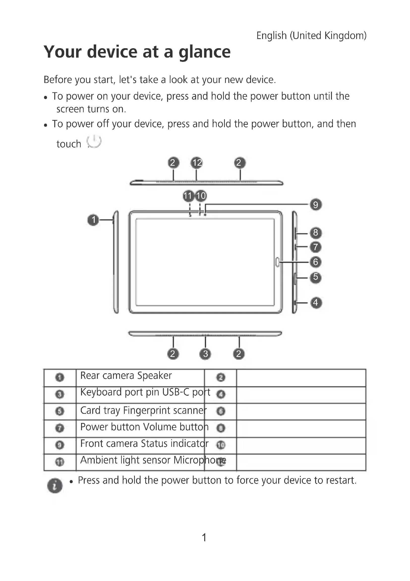 Rear camera Speaker Keyboard port pin USB-C port Card tray Fingerprint scanner Power button Volume button Front camera Status indicator Ambient light sensor Microphone l Press and hold the power button to force your device to restart. English (United Kingdom) 1Getting Started Follow the instructions in the following gures to set up your device. NJDSP4% OBOP4*. l Do not insert or remove the SIM card when your device is powered on. Be careful not to scratch your device or hurt yourself when using the eject pin. Store the eject pin out of the reach of children to prevent accidental swallowing or injury. Do not use cut or modied SIM or microSD cards with your device as these may not be recognised and could damage the card tray (slot). 2M-Pen