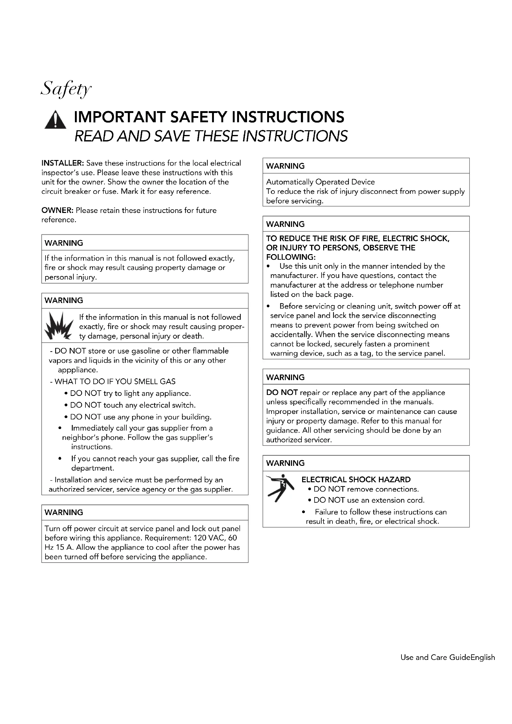 INSTALLER: Save these instructions for the local electrical inspector’s use. Please leave these instructions with this unit for the owner. Show the owner the location of the circuit breaker or fuse. Mark it for easy reference. OWNER: Please retain these instructions for future reference. WARNING If the information in this manual is not followed exactly, re or shock may result causing property damage or personal injury. WARNING If the information in this manual is not followed exactly, re or shock may result causing proper- ty damage, personal injury or death. - DO NOT store or use gasoline or other ammable vapors and liquids in the vicinity of this or any other apppliance. - WHAT TO DO IF YOU SMELL GAS