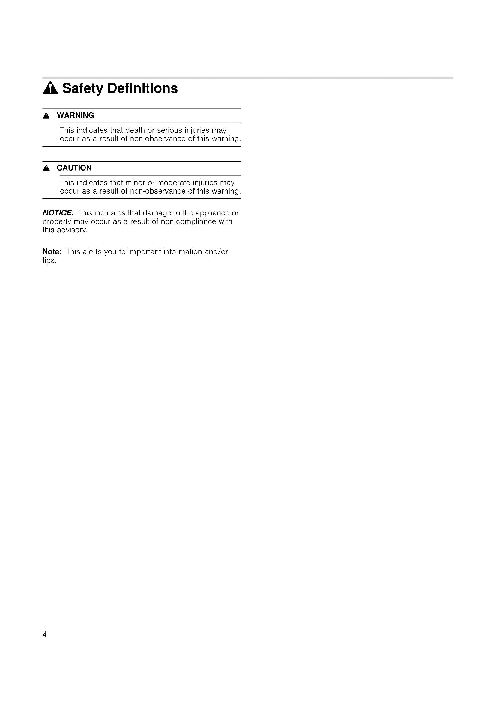 9 Safety Definitions Safety Definitions 9 WARNING This indicates that death or serious injuries may occur as a result of non-observance of this warning. 9 CAUTION This indicates that minor or moderate injuries may occur as a result of non-observance of this warning. NOTICE: This indicates that damage to the appliance or property may occur as a result of non-compliance with this advisory. Note: This alerts you to important information and/or tips.5