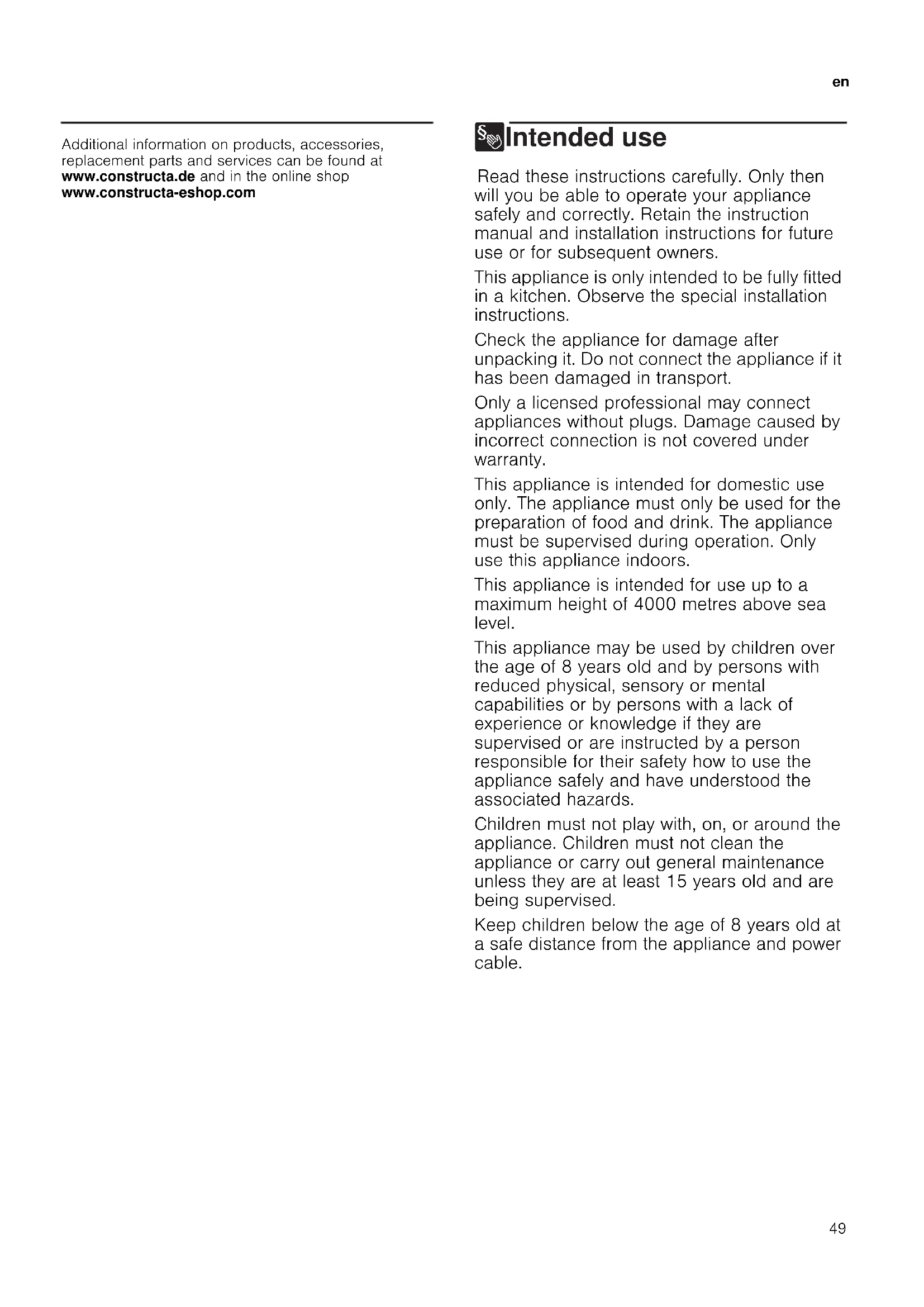 Produktinfo Additional information on products, accessories, replacement parts and services can be found at www.constructa.de and in the online shop www.constructa-eshop.com 8Intended use Intended use Read these instructions carefully. Only then will you be able to operate your appliance safely and correctly. Retain the instruction manual and installation instructions for future use or for subsequent owners. This appliance is only intended to be fully fitted in a kitchen. Observe the special installation instructions. Check the appliance for damage after unpacking it. Do not connect the appliance if it has been damaged in transport. Only a licensed professional may connect appliances without plugs. Damage caused by incorrect connection is not covered under warranty. This appliance is intended for domestic use only. The appliance must only be used for the preparation of food and drink. The appliance must be supervised during operation. Only use this appliance indoors. This appliance is intended for use up to a maximum height of 4000 metres above sea level. This appliance may be used by children over the age of 8 years old and by persons with reduced physical, sensory or mental capabilities or by persons with a lack of experience or knowledge if they are supervised or are instructed by a person responsible for their safety how to use the appliance safely and have understood the associated hazards. Children must not play with, on, or around the appliance. Children must not clean the appliance or carry out general maintenance unless they are at least 15 years old and are being supervised. Keep children below the age of 8 years old at a safe distance from the appliance and power cable.en Important safety information