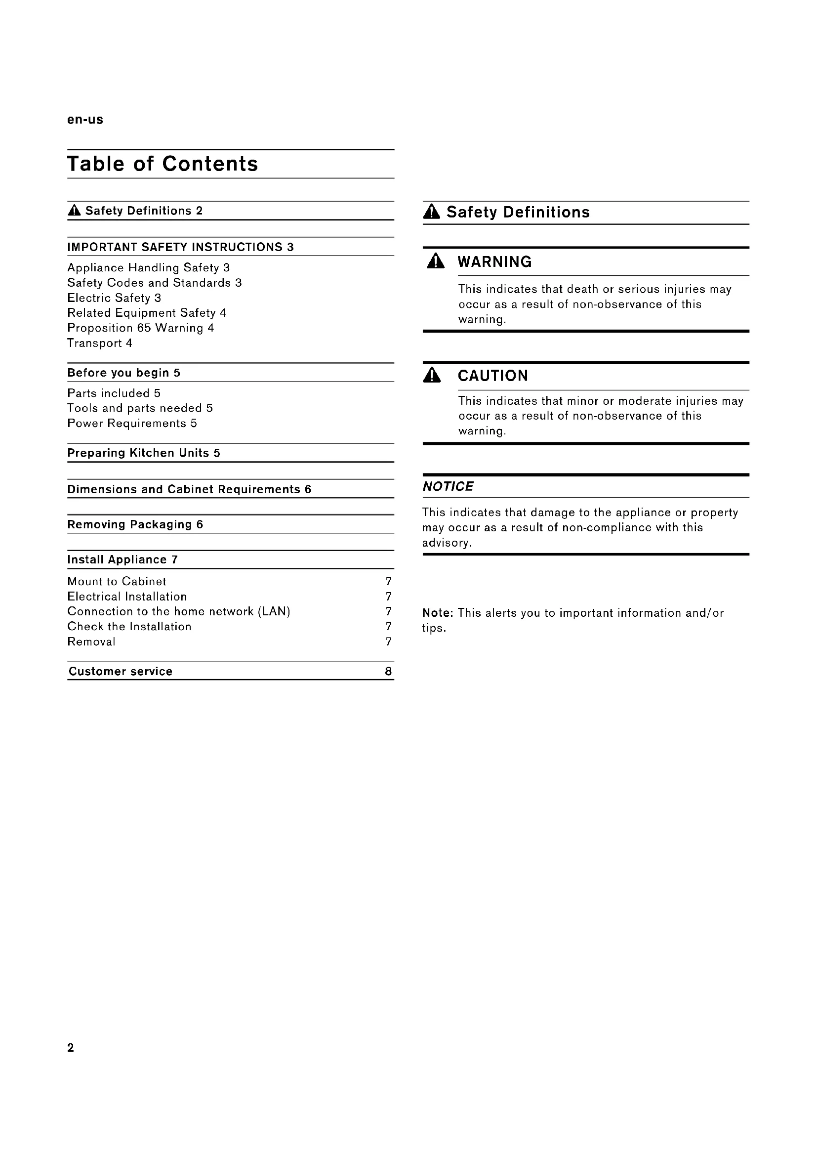 *DJJHQDX Installation instructions2 Notice de montage9 Instrucciones de instalación17 EB 333 611 Oven Four Horno2 en-us Table of Contents Installation instructions9 Safety Definitions 2IMPORTANT SAFETY INSTRUCTIONS 3Appliance Handling Safety 3Safety Codes and Standards 3Electric Safety 3Related Equipment Safety 4Proposition 65 Warning 4Transport 4Before you begin 5Parts included 5Tools and parts needed 5Power Requirements 5Preparing Kitchen Units 5Dimensions and Cabinet Requirements 6Removing Packaging 6Install Appliance 7Mount to Cabinet 7Electrical Installation 7Connection to the home network (LAN) 7Check the Installation 7Removal 7 Customer service 8 9 Safety Definitions Safety Definitions 9 WARNING This indicates that death or serious injuries may occur as a result of non-observance of this warning. 9 CAUTION This indicates that minor or moderate injuries may occur as a result of non-observance of this warning.NOTICEThis indicates that damage to the appliance or property may occur as a result of non-compliance with this advisory.Note: This alerts you to important information and/or tips.3