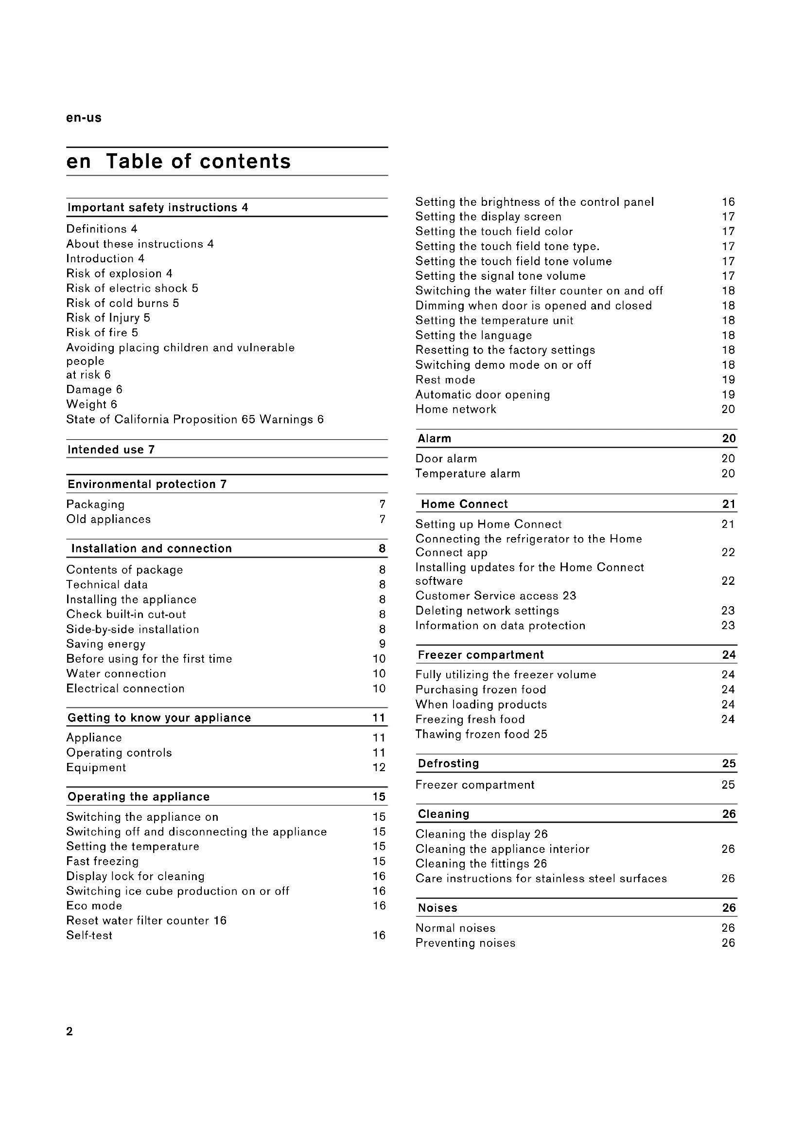 Operating the appliance 15 Switching the appliance on 15 Switching off and disconnecting the appliance 15 Setting the temperature 15 Fast freezing 15 Display lock for cleaning 16 Switching ice cube production on or off 16 Eco mode 16 Reset water filter counter 16 Self-test 16 Setting the brightness of the control panel 16 Setting the display screen 17 Setting the touch field color 17 Setting the touch field tone type. 17 Setting the touch field tone volume 17 Setting the signal tone volume 17 Switching the water filter counter on and off 18 Dimming when door is opened and closed 18 Setting the temperature unit 18 Setting the language 18 Resetting to the factory settings 18 Switching demo mode on or off 18 Rest mode 19 Automatic door opening 19 Home network 20