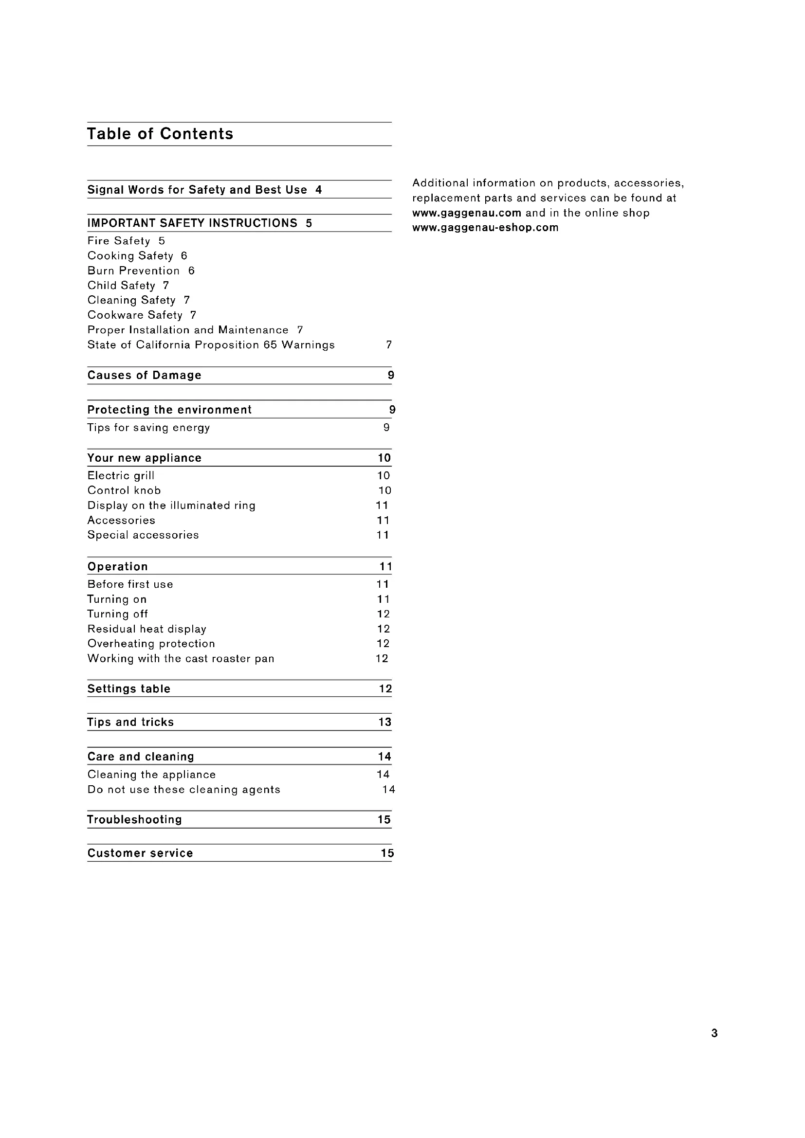Fire Safety 5 Cooking Safety 6 Burn Prevention 6 Child Safety 7 Cleaning Safety 7 Cookware Safety 7 Proper Installation and Maintenance 7 State of California Proposition 65 Warnings 7 Causes of Damage 9 Protecting the environment 9 Tips for saving energy 9 Your new appliance 10 Electric grill 10 Control knob 10 Display on the illuminated ring 11 Accessories 11 Special accessories 11 Operation 11 Before first use 11 Turning on 11 Turning off 12 Residual heat display 12 Overheating protection 12 Working with the cast roaster pan 12 Settings table 12 Tips and tricks 13 Care and cleaning 14 Cleaning the appliance 14 Do not use these cleaning agents 14 Troubleshooting 15 Customer service 15 Additional information on products, accessories, replacement parts and services can be found at www.gaggenau.com and in the online shop www.gaggenau-eshop.com4 Signal Words for Safety and Best Use 9 WARNING This indicates that death or serious injuries may occur as a result of non-observance of this warning. 9 CAUTION This indicates that minor or moderate injuries may occur as a result of non-observance of this warning. NOTICE: This indicates that damage to the appliance or property may occur as a result of non-compliance with this advisory. Note: This alerts you to important information and/or tips.5