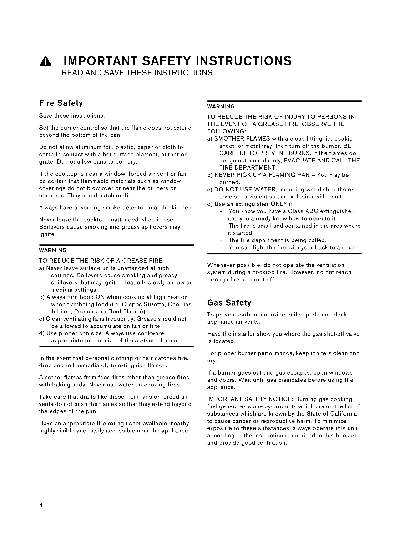 Fire Safety Save these instructions. Set the burner control so that the flame does not extend beyond the bottom of the pan. Do not allow aluminum foil, plastic, paper or cloth to come in contact with a hot surface element, burner or grate. Do not allow pans to boil dry. If the cooktop is near a window, forced air vent or fan, be certain that flammable materials such as window coverings do not blow over or near the burners or elements. They could catch on fire. Always have a working smoke detector near the kitchen. Never leave the cooktop unattended when in use. Boilovers cause smoking and greasy spillovers may ignite. WARNING TO REDUCE THE RISK OF A GREASE FIRE: a) Never leave surface units unattended at high settings. Boilovers cause smoking and greasy spillovers that may ignite. Heat oils slowly on low or medium settings. b) Always turn hood ON when cooking at high heat or when flambéing food (i.e. Crepes Suzette, Cherries Jubilee, Peppercorn Beef Flambé). c) Clean ventilating fans frequently. Grease should not be allowed to accumulate on fan or filter. d) Use proper pan size. Always use cookware appropriate for the size of the surface element. In the event that personal clothing or hair catches fire, drop and roll immediately to extinguish flames. Smother flames from food fires other than grease fires with baking soda. Never use water on cooking fires. Take care that drafts like those from fans or forced air vents do not push the flames so that they extend beyond the edges of the pan. Have an appropriate fire extinguisher available, nearby, highly visible and easily accessible near the appliance. WARNING TO REDUCE THE RISK OF INJURY TO PERSONS IN THE EVENT OF A GREASE FIRE, OBSERVE THE FOLLOWING: a) SMOTHER FLAMES with a close-fitting lid, cookie sheet, or metal tray, then turn off the burner. BE CAREFUL TO PREVENT BURNS. If the flames do not go out immediately, EVACUATE AND CALL THE FIRE DEPARTMENT. b) NEVER PICK UP A FLAMING PAN – You may be burned. c) DO NOT USE WATER, including wet dishcloths or towels – a violent steam explosion will result. d) Use an extinguisher ONLY if: ‒ You know you have a Class ABC extinguisher, and you already know how to operate it. ‒ The fire is small and contained in the area where it started. ‒ The fire department is being called. ‒ You can fight the fire with your back to an exit. Whenever possible, do not operate the ventilation system during a cooktop fire. However, do not reach through fire to turn it off. Gas Safety To prevent carbon monoxide build-up, do not block appliance air vents. Have the installer show you where the gas shut-off valve is located. For proper burner performance, keep igniters clean and dry. If a burner goes out and gas escapes, open windows and doors. Wait until gas dissipates before using the appliance. IMPORTANT SAFETY NOTICE: Burning gas cooking fuel generates some by-products which are on the list of substances which are known by the State of California to cause cancer or reproductive harm. To minimize exposure to these substances, always operate this unit according to the instructions contained in this booklet and provide good ventilation.5