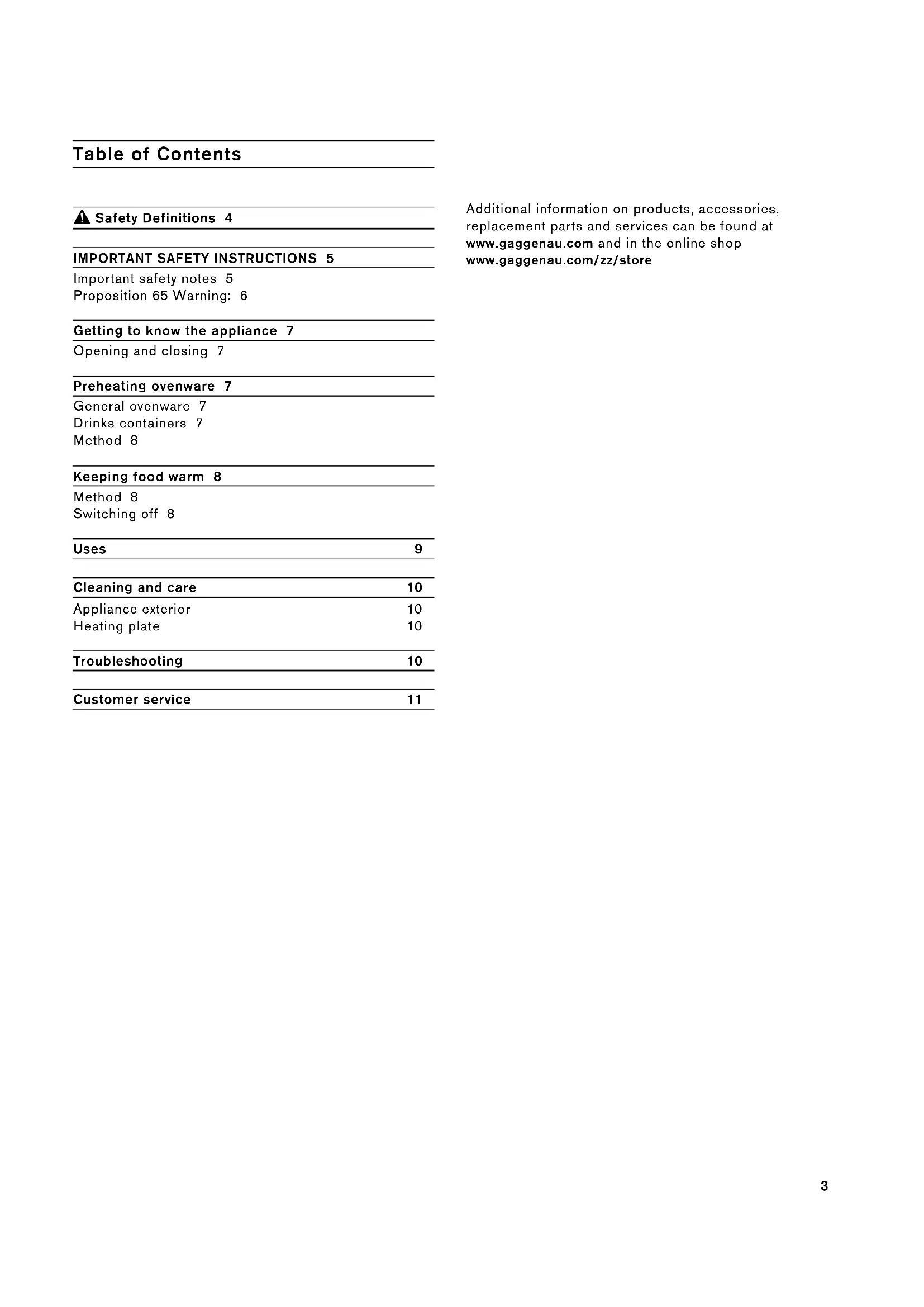 Important safety notes 5 Proposition 65 Warning: 6 Getting to know the appliance 7 Opening and closing 7 Preheating ovenware 7 General ovenware 7 Drinks containers 7 Method 8 Keeping food warm 8 Method 8 Switching off 8 Uses 9 Cleaning and care 10 Appliance exterior 10 Heating plate 10 Troubleshooting 10 Customer service 11 Additional information on products, accessories, replacement parts and services can be found at www.gaggenau.com and in the online shop www.gaggenau.com/zz/store4 9 Safety Definitions Saf ety Definitions 9 WARNING This indicates that death or serious injuries may occur as a result of non-observance of this warning. 9 CAUTION This indicates that minor or moderate injuries may occur as a result of non-observance of this warning. NOTICE: This indicates that damage to the appliance or property may occur as a result of non-compliance with this advisory. Note: This alerts you to important information and/or tips.5