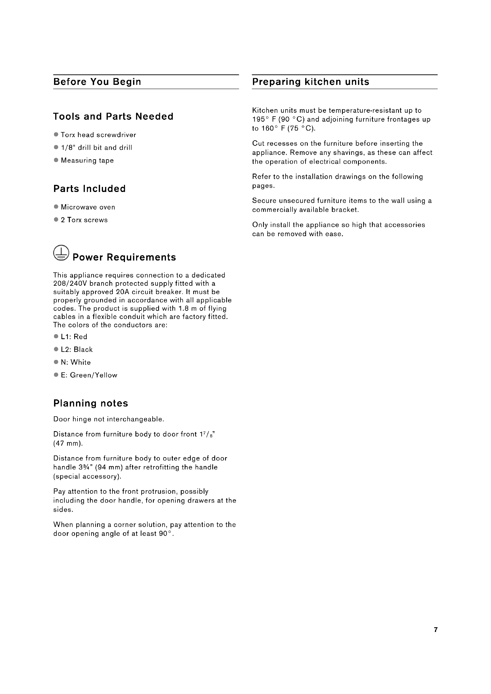 po (5 mm) entre l'appareil et les caissons adjacents.7 Before You Begin Tools and Parts Needed ▯ Torx head screwdriver ▯ 1/8" drill bit and drill ▯ Measuring tape Parts Included ▯ Microwave oven ▯ 2 Torx screws Power Requirements This appliance requires connection to a dedicated 208/240V branch protected supply fitted with a suitably approved 20A circuit breaker. It must be properly grounded in accordance with all applicable codes. The product is supplied with 1.8 m of flying cables in a flexible conduit which are factory fitted. The colors of the conductors are: ▯ L1: Red ▯ L2: Black ▯ N: White ▯ E: Green/Yellow Planning notes Door hinge not interchangeable. Distance from furniture body to door front 1