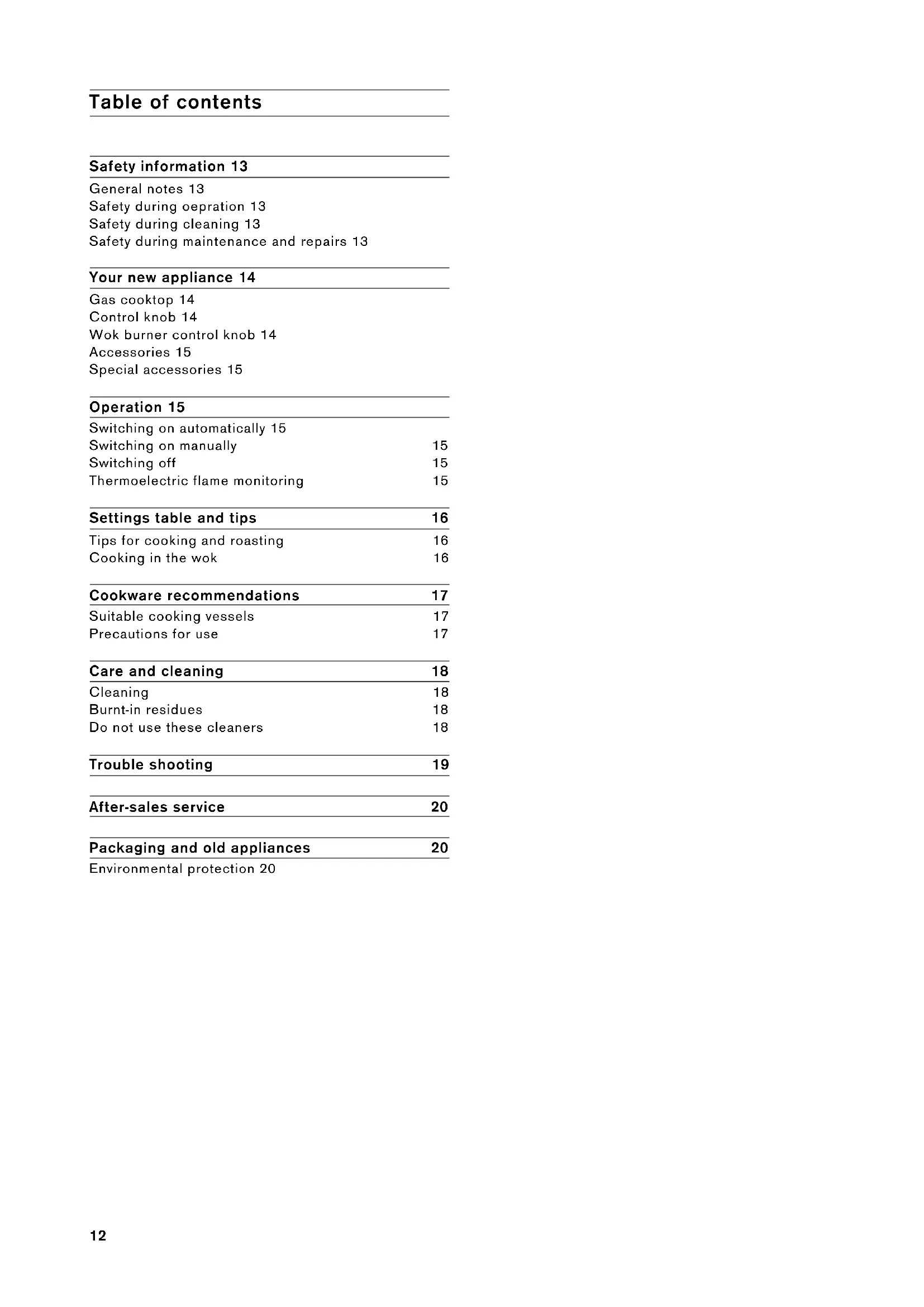 Control knobs Economy burner 1 kW The markings show the position of the corresponding burner and the setting between high and low heat. The flame setting is infinitely variable between high and low. Turning the wok burner control knob beyond the middle flame symbol activates the outer flame ring.15 Accessories As standard, your appliance comes with the following accessories: ▯ Wok ring (647660) For using a wok pan on the wok burner. Special accessories You can order the following special accessories from our after-sales service or on our website: ▯ Wok pan (WP 400 001) Multi-layer material wok pan, with curved base and handle, Ø 36 cm, 6 liters volume,10 cm high. ▯ Coffee maker support (088903) Only use the coffee maker support on the economy burner with cooking vessels no more than 9 cm in diameter (e.g. coffee maker). ▯ Simmering plate (648786) Only use the simmering plate on the economy burner. This accessory has been designed to reduce the heat at the lowest power setting (low heat). Place the simmering plate on the pan support with the cones facing upwards, never directly on the burner. Centre the pan over the simmering plate. Only use the accessories as specified. The manufacturer accepts no liability if these accessories are used incorrectly. Operation The markings on the control knobs show the position of the corresponding burner and the setting between high and low heat. The flame setting is infinitely variable between high and low heat. Notes ‒ Only light a burner if all pan supports and burner parts are properly assembled. ‒ Make sure the burners and ignition sparkers are clean and dry. ‒ Only use the recommended accessories. Do not cover the stainless steel cooktop base (e.g. with aluminium foil). Switching on automatically Your cooktop features ignition sparkers for automatic ignition. 1 Place a suitable pot or pan on the corresponding cooking position. 2 Fully press down the corresponding control knob and turn it anticlockwise to the required position. The burner lights automatically. 3 Keep the control knob pressed for a few seconds after ignition. The flame size can be set continuously between high and low by slowly turning the control knob. Switching on manually During a power cut you can ignite the burners manually. 1 Place a suitable pot or pan on the chosen burner. 2 Press the corresponding control knob and turn it anticlockwise to the required setting. Keep the control knob pressed. 3 Use a gas lighter or a match to ignite the burner. Keep the control knob pressed for a few seconds after ignition. Switching off Turn the corresponding control knob clockwise to the OFF position. Thermoelectric flame monitoring For your safety, this cooktop features thermoelectric flame monitoring. This prevents gas escaping, if a burner accidentally goes off during use (for example from a draught). Should a burner accidentally go off during use, turn the control knob to the OFF position and wait at least 30 seconds before re-igniting the burner.16 Settings table and tips Tips for cooking and roasting The values given in the settings table must be looked upon as recommended values. The heat required depends not only on the type and condition of the food, but also the size and contents of the pot. Due to the high performance of the cooktop, fat and oil will heat up quickly. Never leave the cooktop unattended, fat can ignite, food can burn. Preferably use the rear cooking zones to prepare meals, that need longer to cook. Preferably use the high output burners or the wok burner for brief cooking, deep fat frying and searing of large quantities. Cooking in the wok Note Always place the wok ring on the pan support above the wok burner when cooking in a wok. Make sure that the wok is positioned safely on the wok ring while cooking. We recommend using a round-bottom wok. You can order a high-quality wok pan as a special accessory (WP 400 001). Only use oil that is suitable for frying at high temperatures, for example peanut oil. Fry the food quickly on a high heat while stirring continuosly. Vegetables should stay crispy. Use a heat resistant, flat ladle with a long handle to stir the food and take it out of the wok pan. Cooking level Cooking method Examples High heat ‘ Boiling Water Searing Meat Heating Fat, liquids Boiling Soup, sauce Blanching Vegetables From ‘ to ’ Roasting Meat, fish, potatoes Baking Pancakes, egg dishes Simmering in open pot Dumplings, sausages, beef for making soup Simmering Sweet sauces, sauces Boiling with closed lid Soup, potatoes Steaming Vegetables, fish Stewing Vegetables, fruit, fish Braising Goulash, roasts, vegetables Low heat ’ Thawing Frozen foods Slow cooking Rice, pulses Reheating Soup, casserole, vegetables in a sauce17 Cookware recommendations The following tips can help you save energy and avoid damage to your cookware. Suitable cooking vessels Precautions for use Burner Pot base, recommended diameter Pot base, minimum diameter Economy burner 100 - 180 mm 90 mm Standard burner, rear