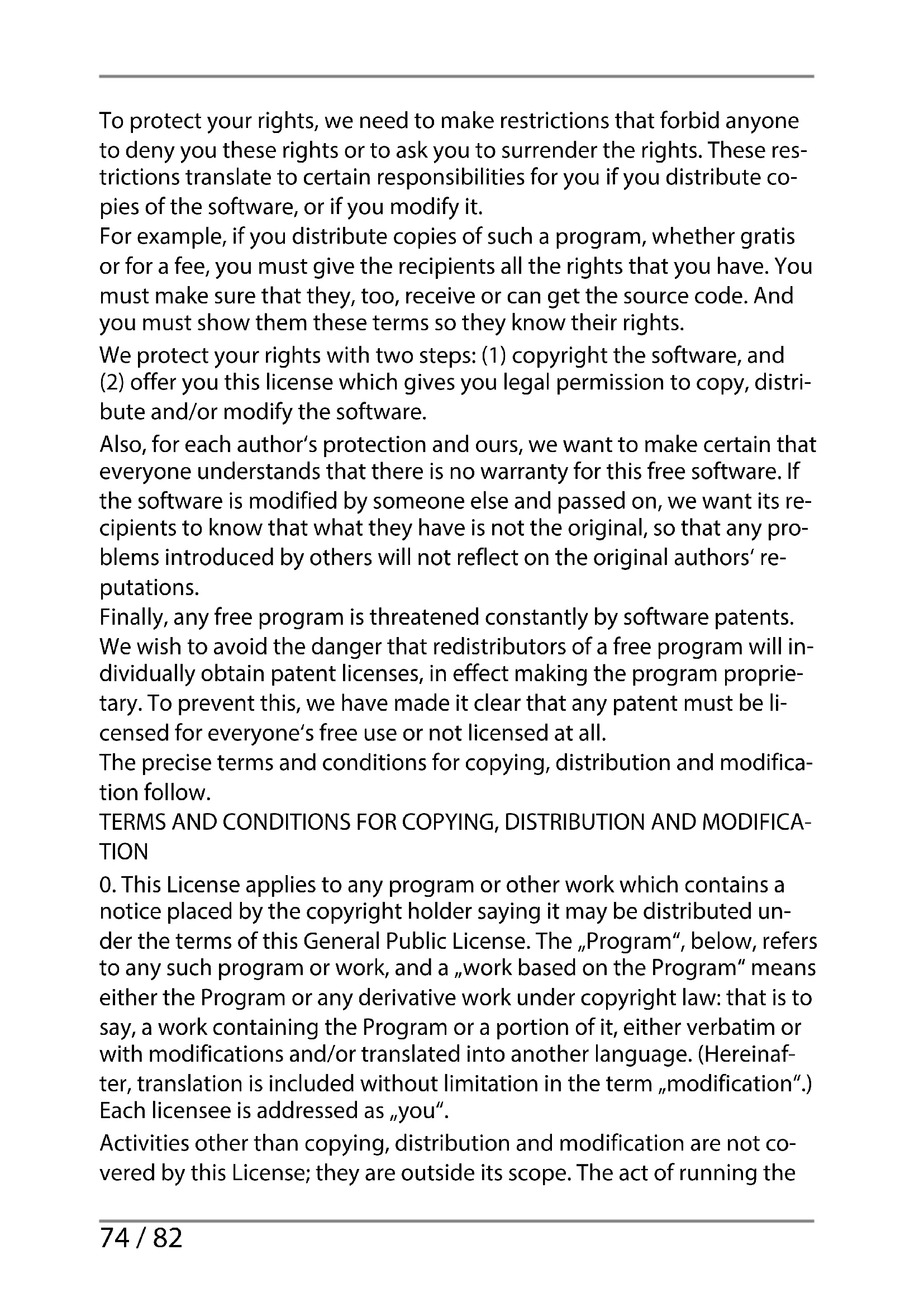 gement or for any other reason (not limited to patent issues), conditions are imposed on you (whether by court order, agreement or otherwise) that contradict the conditions of this License, they do not excuse you from the conditions of this License. If you cannot distribute so as to satisfy simultaneously your obligations under this License and any other pertinent obligations, then as a conse- quence you may not distribute the Program at all. For example, if a pa- tent license would not permit royalty-free redistribution of the Program by all those who receive copies directly or indirectly through you, then the only way you could satisfy both it and this License would be to re- frain entirely from distribution of the Program. If any portion of this section is held invalid or unenforceable under any particular circumstance, the balance of the section is intended to apply and the section as a whole is intended to apply in other circumstances. It is not the purpose of this section to induce you to infringe any pa- tents or other property right claims or to contest validity of any such claims; this section has the sole purpose of protecting the integrity of the free software distribution system, which is implemented by public li- cense practices. Many people have made generous contributions to the wide range of software distributed through that system in reliance on consistent application of that system; it is up to the author/donor to de- cide if he or she is willing to distribute software through any other sys- tem and a licensee cannot impose that choice. E10320_E10318_E10317 FR Generic Final Content.indd 78E10320_E10318_E10317 FR Generic Final Content.indd 78 05.02.2014 09:03:1805.02.2014 09:03:1879 / 82 This section is intended to make thoroughly clear what is believed to be a consequence of the rest of this License.