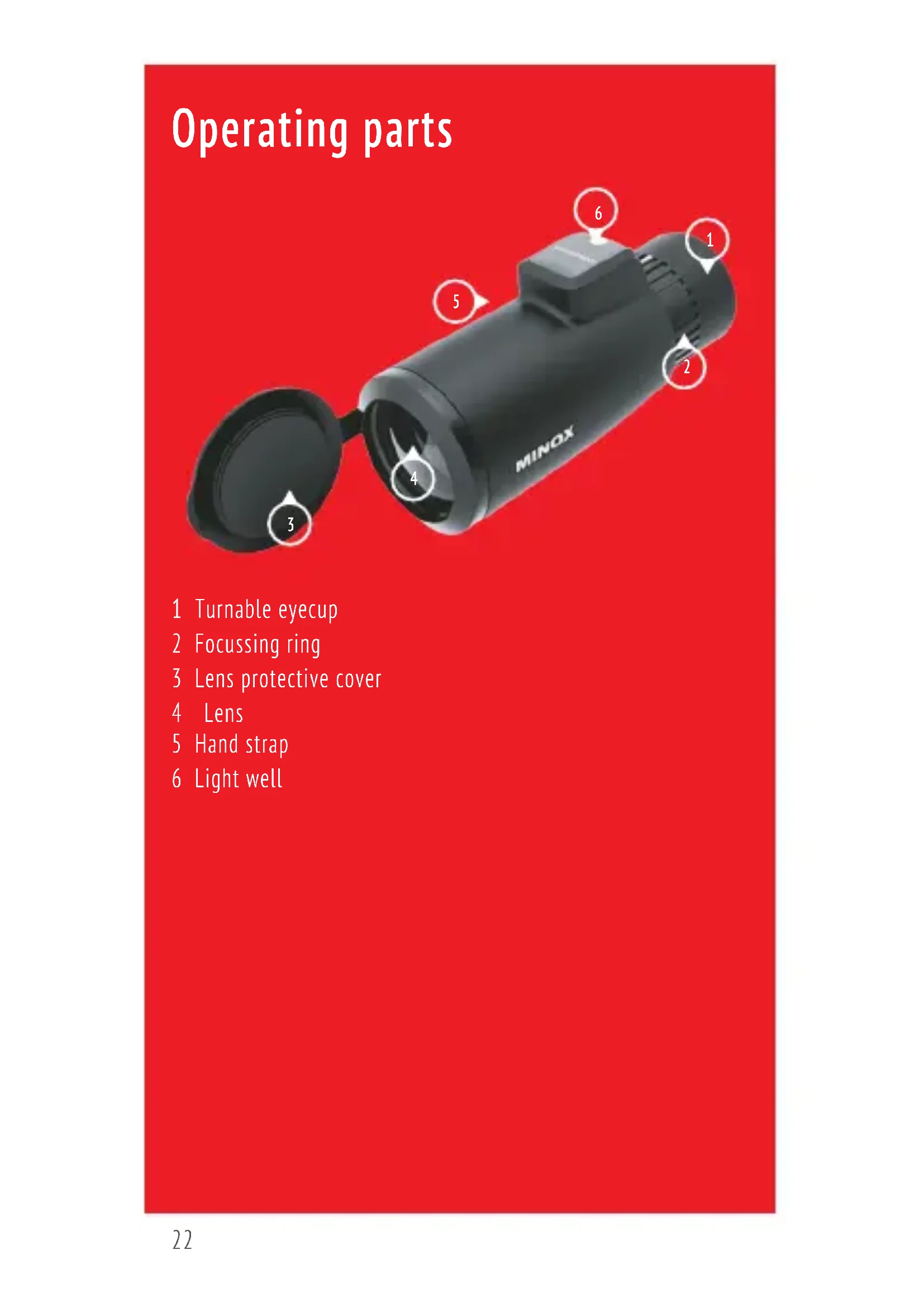 1 Turnable eyecup 2 Focussing ring 3 Lens protective cover 4 Lens 5 Hand strap 6 Light well MINOX_BDA_MD7x42C_65x115mm_DE_EN_FR_ES_IT_V01.indd 23MINOX_BDA_MD7x42C_65x115mm_DE_EN_FR_ES_IT_V01.indd 23 08.06.2021 16:11:1208.06.2021 16:11:1224 Introduction With the MINOX MD 7x42 C, you have chosen a product of the highest optical and mechanical precision quality. The monocular is available in black or in white, with different graticules. This manual should help to get familiar with the monocular and get the most pleasure and enjoyment out of it. We wish every satisfaction with your new MINOX product! Adjustments Important note for wearers of glasses For users who wear glasses while using the monocular, turn the eyecup (1) all the way to the right. Those who do not wear glasses, turn the eyecup all the way to the left. This provides for a perfect eye distance to the ocular lens, enabling a full field of view with- out vignetting.