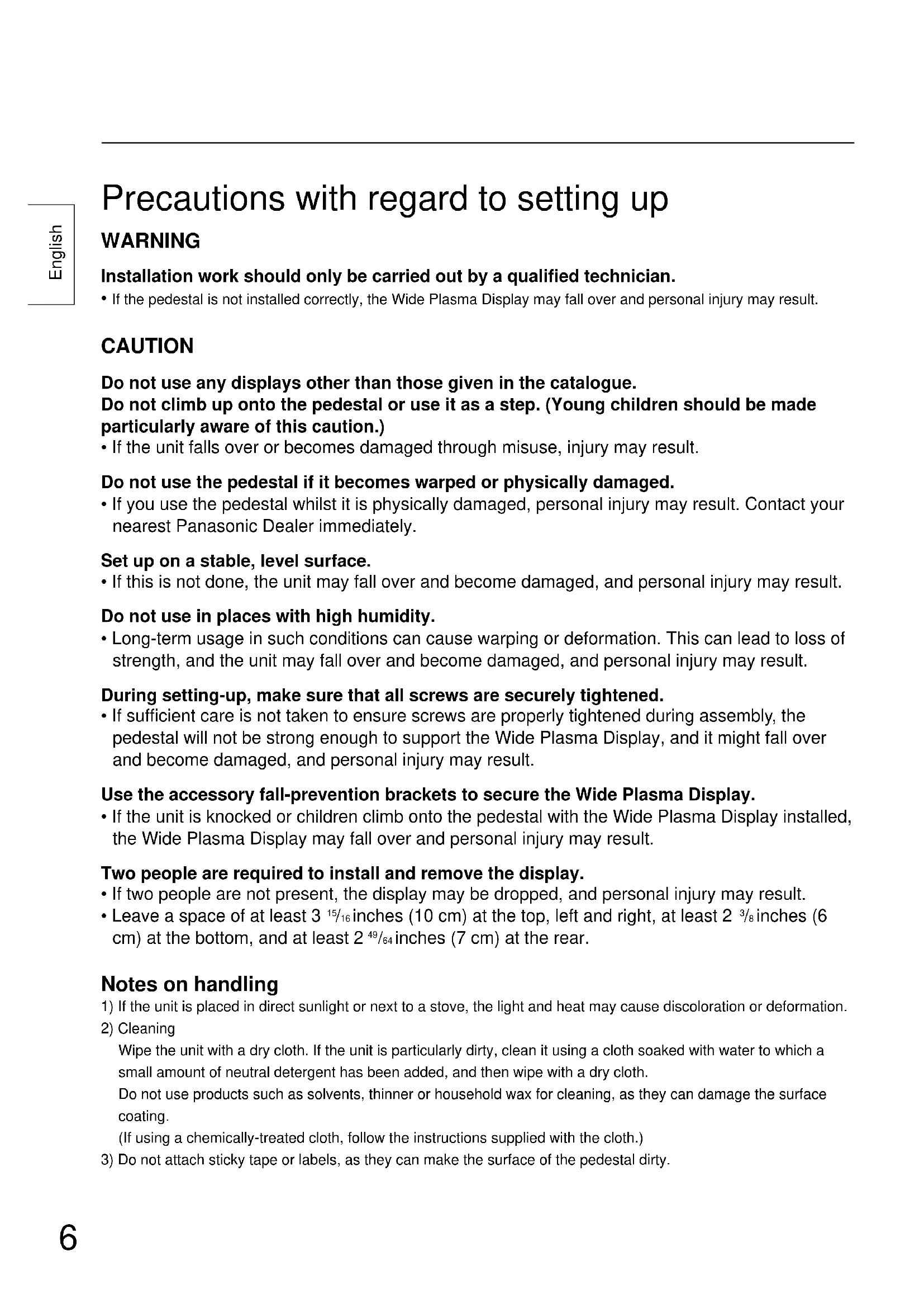 - If the pedestal is not installed correctly, the Wide Plasma Display may fall over and personal injury may result. CAUTION Do not use any displays other than those given in the catalogue. Do not climb up onto the pedestal or use it as a step. (Young children should be made particularly aware of this caution.)