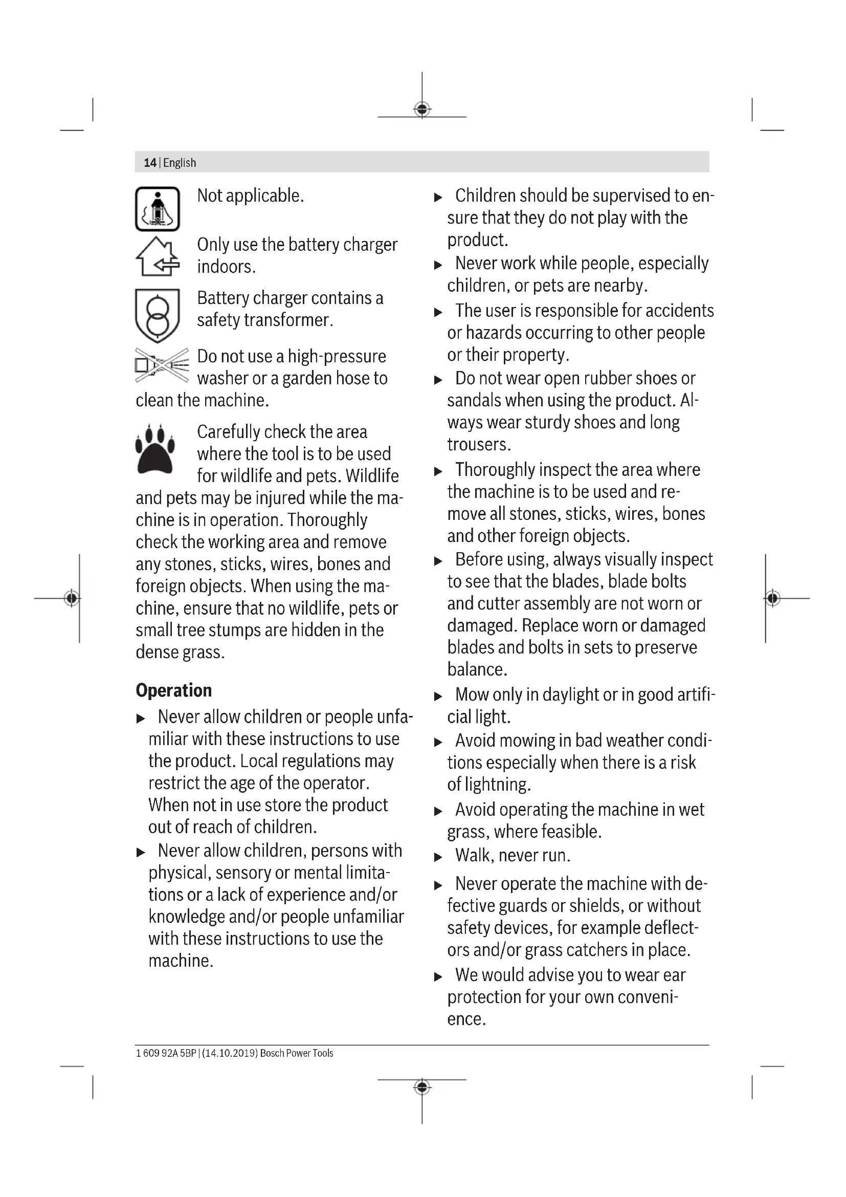 to the product when operat- ing. Caution: Do not touch rotat- ing blades. Sharp blade(s). Beware of severing toes or fingers. Switch off and remove isol- ator switch before adjusting, cleaning and before leaving the product unattended for any period. Not applicable. Wait until all machine com- ponents have completely stopped before touching them. The blades continue to rotate after the machine is switched off, a ro- tating blade can cause injury. Do not use the product in the rain or leave it outdoors when it is raining. Beware electric shock hazard. Bosch Power Tools 1 609 92A 5BP | (14.10.2019)14 | English Not applicable. Only use the battery charger indoors. Battery charger contains a safety transformer. Do not use a high-pressure washer or a garden hose to clean the machine. Carefully check the area where the tool is to be used for wildlife and pets. Wildlife and pets may be injured while the ma- chine is in operation. Thoroughly check the working area and remove any stones, sticks, wires, bones and foreign objects. When using the ma- chine, ensure that no wildlife, pets or small tree stumps are hidden in the dense grass. Operation u Never allow children or people unfa- miliar with these instructions to use the product. Local regulations may restrict the age of the operator. When not in use store the product out of reach of children. u Never allow children, persons with physical, sensory or mental limita- tions or a lack of experience and/or knowledge and/or people unfamiliar with these instructions to use the machine. u Children should be supervised to en- sure that they do not play with the product. u Never work while people, especially children, or pets are nearby. u The user is responsible for accidents or hazards occurring to other people or their property. u Do not wear open rubber shoes or sandals when using the product. Al- ways wear sturdy shoes and long trousers. u Thoroughly inspect the area where the machine is to be used and re- move all stones, sticks, wires, bones and other foreign objects. u Before using, always visually inspect to see that the blades, blade bolts and cutter assembly are not worn or damaged. Replace worn or damaged blades and bolts in sets to preserve balance. u Mow only in daylight or in good artifi- cial light. u Avoid mowing in bad weather condi- tions especially when there is a risk of lightning. u Avoid operating the machine in wet grass, where feasible. u Walk, never run. u Never operate the machine with de- fective guards or shields, or without safety devices, for example deflect- ors and/or grass catchers in place. u We would advise you to wear ear protection for your own conveni- ence. 1 609 92A 5BP | (14.10.2019) Bosch Power ToolsEnglish | 15 u Never operate the product when you are tired, ill or under the influence of alcohol, drugs or medicine. u Working on banks can be dangerous: − Do not mow on excessively steep slopes. − Always be sure of your footing on slopes or wet grass. − Mow across the face of slopes never up and down. − Exercise extreme caution when changing direction on slopes. u Use extreme caution when stepping back or pulling the machine towards you. u Never mow by pulling the mower to- wards you. u Wait until the blades stop if the ma- chine has to be tilted for transporta- tion when crossing surfaces other than grass and when transporting the machine to and from the area to be mowed. u Do not tilt the machine when starting or switching on the motor. u Switch on the motor according to the instructions with feet well away from rotating parts. u Do not put hands or feet near or un- der rotating parts. u Always stand clear of the discharge zone when operating the machine. u Never pick up or carry the machine while the motor is running. u When storing, make sure that all 4 wheels of the garden tool stand on the ground/floor. u Only lift the garden tool with the car- rying handle. Use the carrying handle with care. u Do not modify the product. Unau- thorized modifications may impair the safety of your product and may result in increased noise and vibra- tion. Leaf Collect The leaf collect blade has been de- signed to allow you to pick up autumn leaves from your lawn. In order for this functionality to work within optimal parameters, please note the following: – Only collect leaves with the ma- chine set at maximum cutting height. – Collect leaves from your lawn only. – Before collecting leaves inspect the area where the machine is to be used and keep people, pets, glass structures and cars away from use. Remove the isolator switch: – Whenever you leave the machine. – Before clearing a blockage. – Before checking, cleaning or work- ing on the machine. – After striking a foreign object. In- spect the machine for damage and change the blade as necessary. – If the machine starts to vibrate ab- normally (check immediately). Bosch Power Tools 1 609 92A 5BP | (14.10.2019)16 | English Maintenance u Always wear gardening gloves when handling or working near the sharp blades. u Keep all nuts, bolts and screws tight to ensure safe working with the product. u Check the grass catcher frequently for wear or deterioration. u Inspect the product and replace worn or damaged parts for safety. u Ensure replacement cutting means of the right type are used. u Ensure replacement parts fitted are Bosch-approved. u Before storing, make sure that the product is clean and free of residue. If necessary, clean with a soft dry brush. Safety Instructions and Recommendations for Optimal Handling of the Battery u Ensure the garden tool is switched off and the isolator switch is in the off position before the inserting bat- tery. Inserting the battery pack into machines that have the switch on can cause accidents. u Use only Bosch battery packs intended specifically for the machine. Use of any other battery packs may create a risk of injury and fire. u Do not open the battery. There is a risk of short-circuit- ing. Protect the battery aga