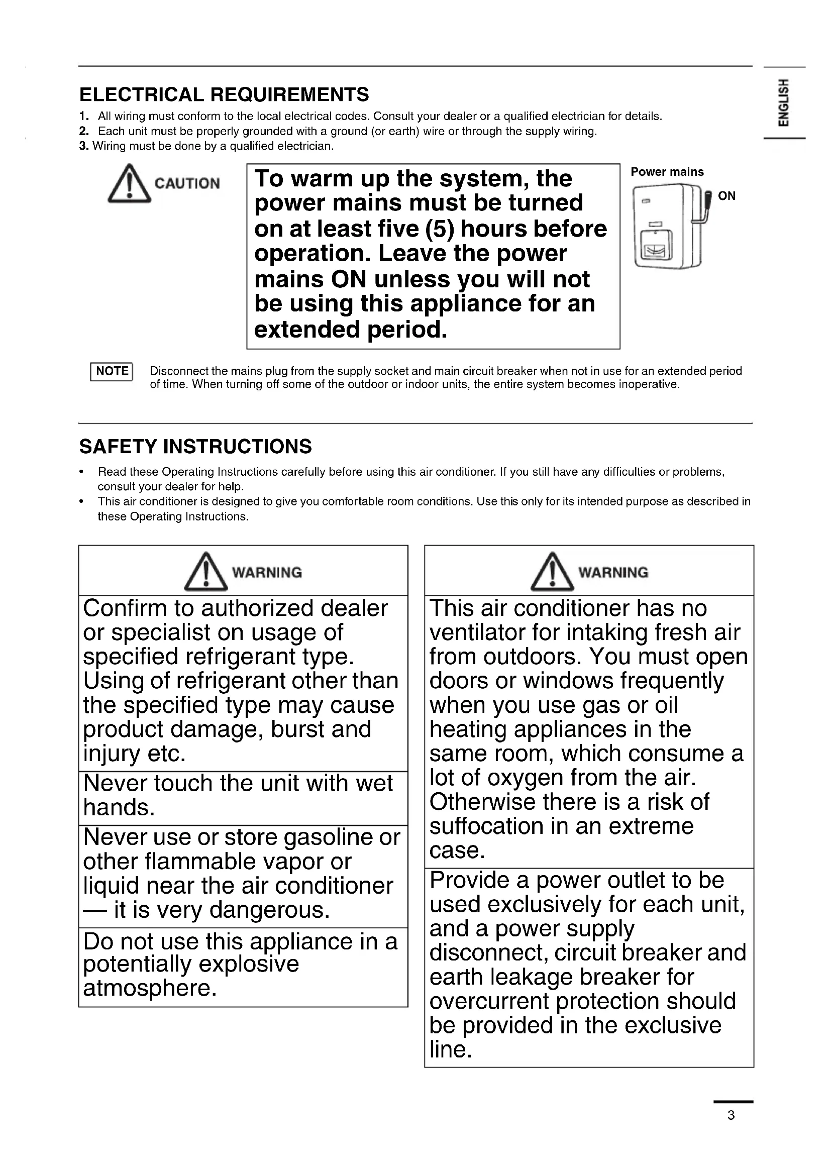 - This air conditioner is designed to give you comfortable room conditions. Use this only for its intended purpose as described in these Operating Instructions. To warm up the system, the power mains must be turned on at least five (5) hours before operation. Leave the power mains ON unless you will not be using this appliance for an extended period. Power mains