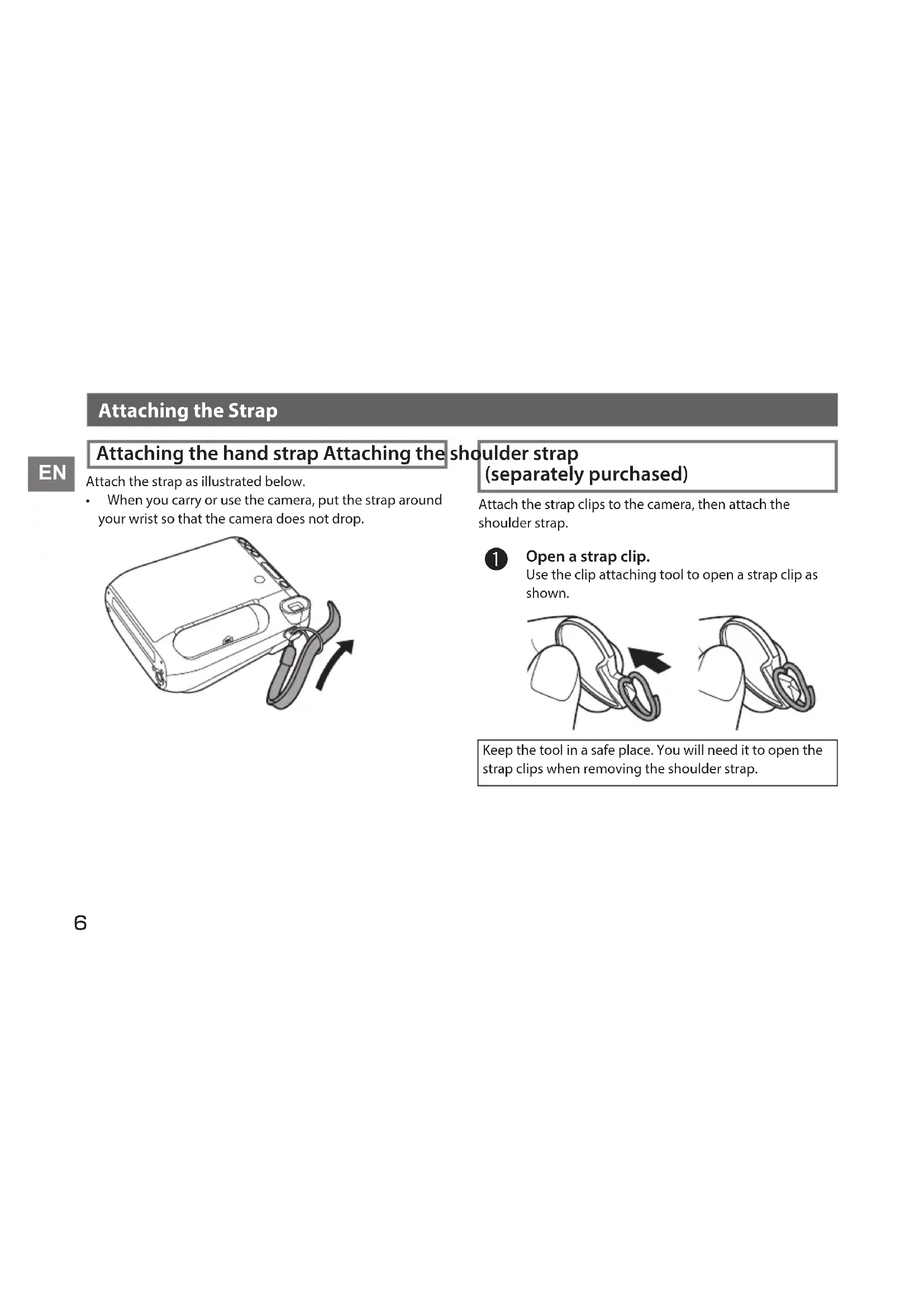 Attaching the hand strap Attaching the shoulder strap (separately purchased) Attach the strap clips to the camera, then attach the shoulder strap. Open a strap clip. Use the clip attaching tool to open a strap clip as shown. Keep the tool in a safe place. You will need it to open the strap clips when removing the shoulder strap. BO-7_6lang.indb 6 2015/7/14 8:47:567