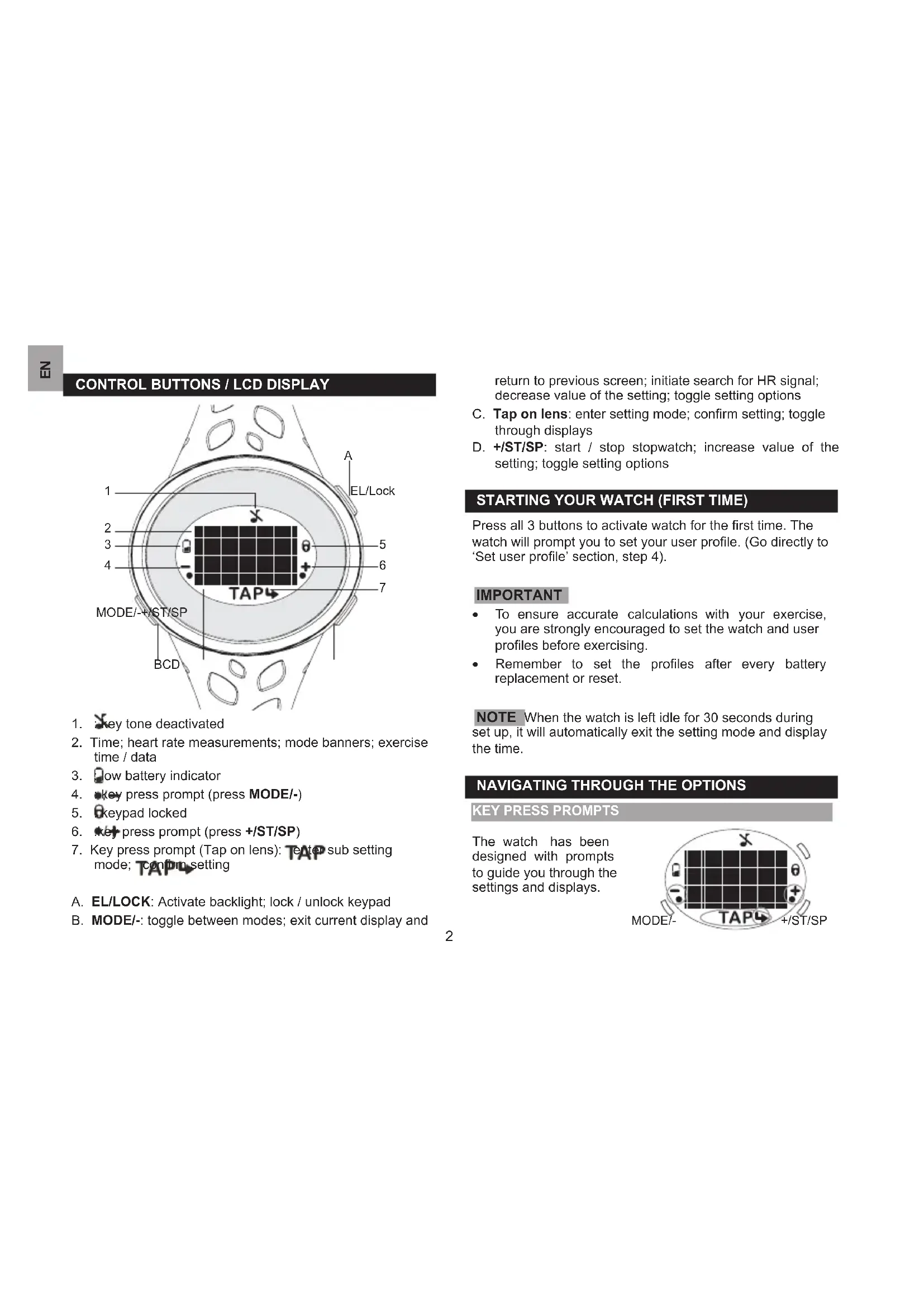 mode; conrm setting A. EL/LOCK: Activate backlight; lock / unlock keypad B. MODE/-: toggle between modes; exit current display and return to previous screen; initiate search for HR signal; decrease value of the setting; toggle setting options C. Tap on lens: enter setting mode; conrm setting; toggle through displays D. +/ST/SP: start / stop stopwatch; increase value of the setting; toggle setting options STARTiNg YOUR WATCH (FiRST TiME) Press all 3 buttons to activate watch for the rst time. The watch will prompt you to set your user prole. (Go directly to ‘Set user prole’ section, step 4). iMPORTANT