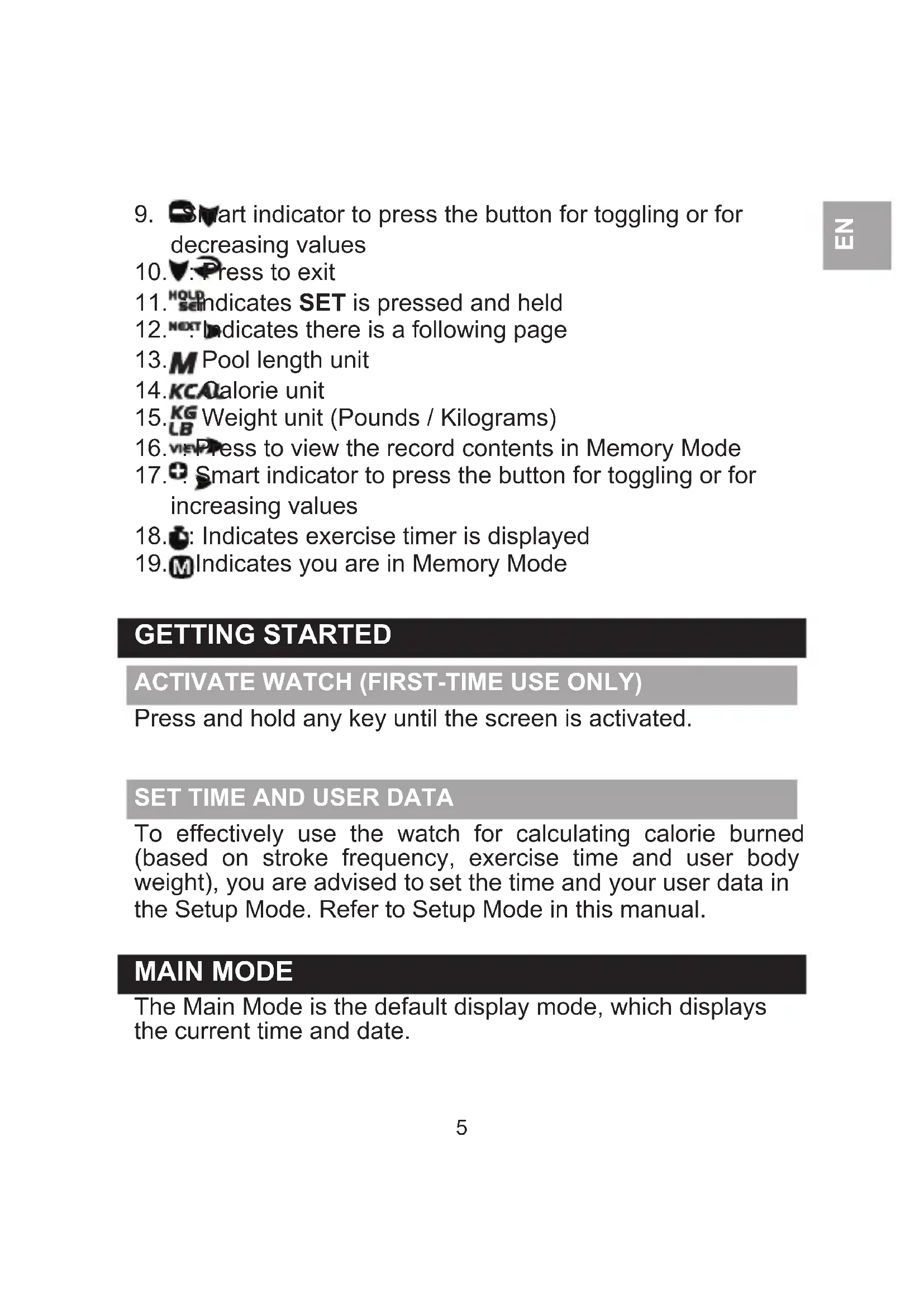 To effectively use the watch for calculating calorie burned (based on stroke frequency, exercise time and user body weight), you are advised to set the time and your user data in the Setup Mode. Refer to Setup Mode in this manual. MAIN MODE The Main Mode is the default display mode, which displays the current time and date.6