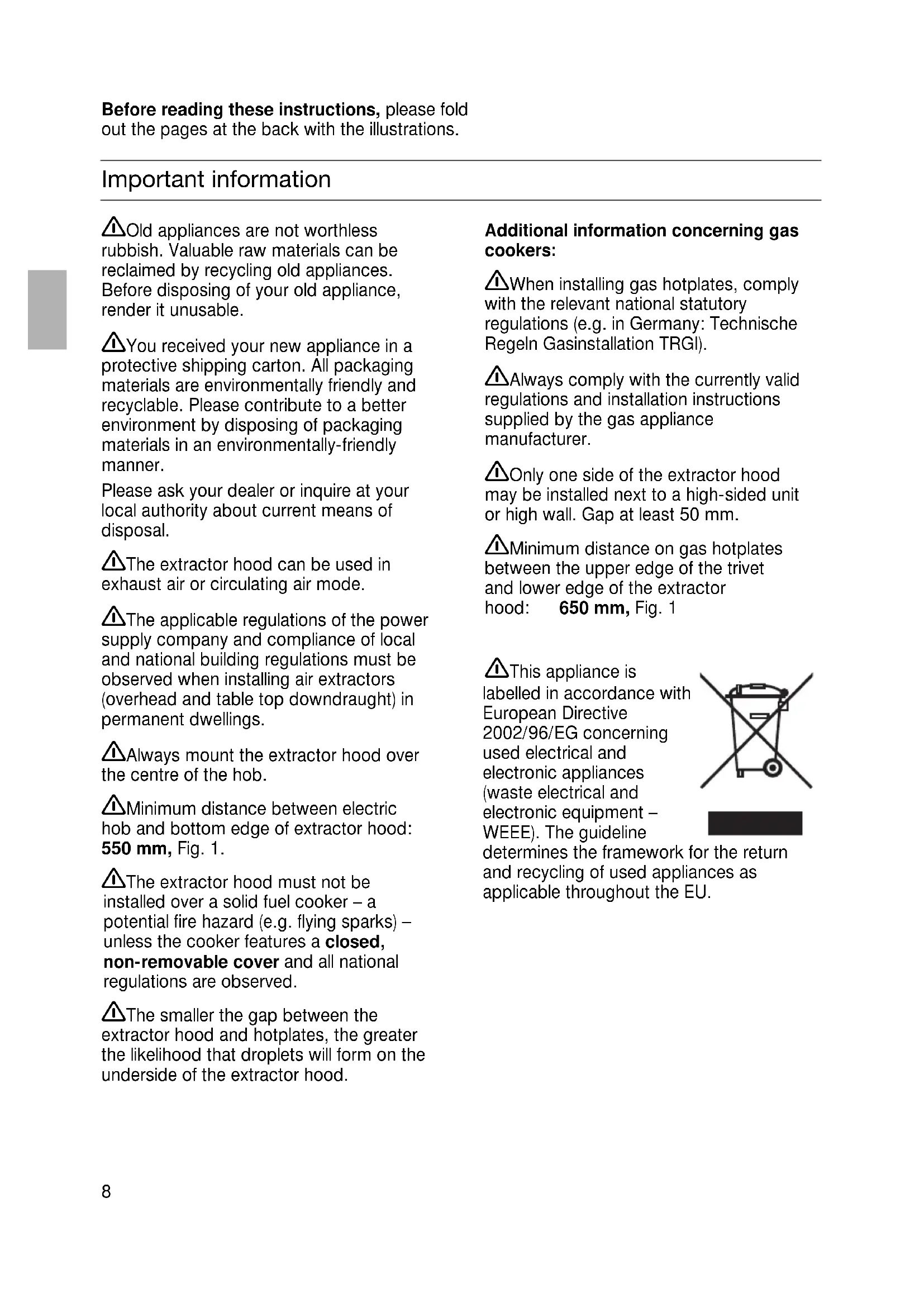 0 leuchtet, zusätzlich die Taste drücken, bis die Anzeige C oder ~ leuchtet. Danach die Taste loslassen. Abluftbetrieb in Umluftbetrieb: ❑ Die Anzeige C erlischt nach kurzer Zeit. Die elektronische Steuerung ist auf Umluftbetrieb eingestellt. Umluftbetrieb in Abluftbetrieb: ❑ Die Anzeige ~ erlischt nach kurzer Zeit. Die elektronische Steuerung ist auf Abluftbetrieb eingestellt.8 Important information Additional information concerning gas cookers: When installing gas hotplates, comply with the relevant national statutory regulations (e.g. in Germany: Technische Regeln Gasinstallation TRGI). Always comply with the currently valid regulations and installation instructions supplied by the gas appliance manufacturer. Only one side of the extractor hood may be installed next to a high-sided unit or high wall. Gap at least 50 mm. Minimum distance on gas hotplates between the upper edge of the trivet and lower edge of the extractor hood: 650 mm, Fig. 1 Old appliances are not worthless rubbish. Valuable raw materials can be reclaimed by recycling old appliances. Before disposing of your old appliance, render it unusable. You received your new appliance in a protective shipping carton. All packaging materials are environmentally friendly and recyclable. Please contribute to a better environment by disposing of packaging materials in an environmentally-friendly manner. Please ask your dealer or inquire at your local authority about current means of disposal. The extractor hood can be used in exhaust air or circulating air mode. The applicable regulations of the power supply company and compliance of local and national building regulations must be observed when installing air extractors (overhead and table top downdraught) in permanent dwellings. Always mount the extractor hood over the centre of the hob. Minimum distance between electric hob and bottom edge of extractor hood: 550 mm, Fig. 1. The extractor hood must not be installed over a solid fuel cooker – a potential fire hazard (e.g. flying sparks) – unless the cooker features a closed, non-removable cover and all national regulations are observed. The smaller the gap between the extractor hood and hotplates, the greater the likelihood that droplets will form on the underside of the extractor hood. Before reading these instructions, please fold out the pages at the back with the illustrations. This appliance is labelled in accordance with European Directive 2002/96/EG concerning used electrical and electronic appliances (waste electrical and electronic equipment – WEEE). The guideline determines the framework for the return and recycling of used appliances as applicable throughout the EU.9 Prior to installation Exhaust-air mode Fig. 2 The exhaust air is discharged upwards through a ventilation shaft or directly through the outside wall into the open.