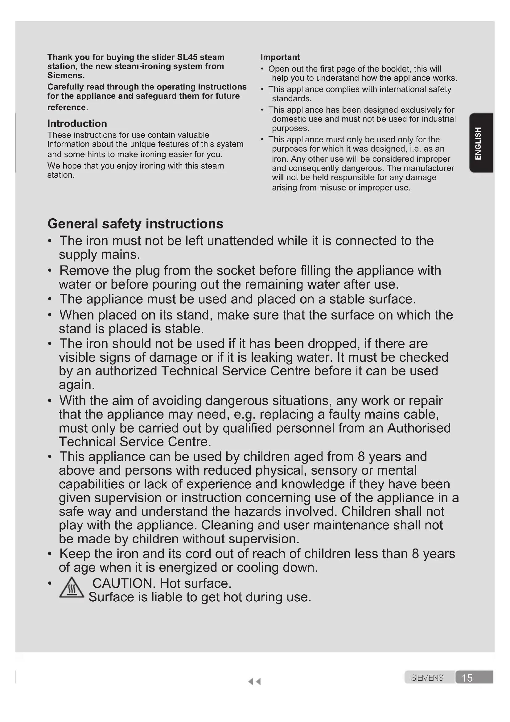 CAUTION. Hot surface. Surface is liable to get hot during use.16 S I E M E N S