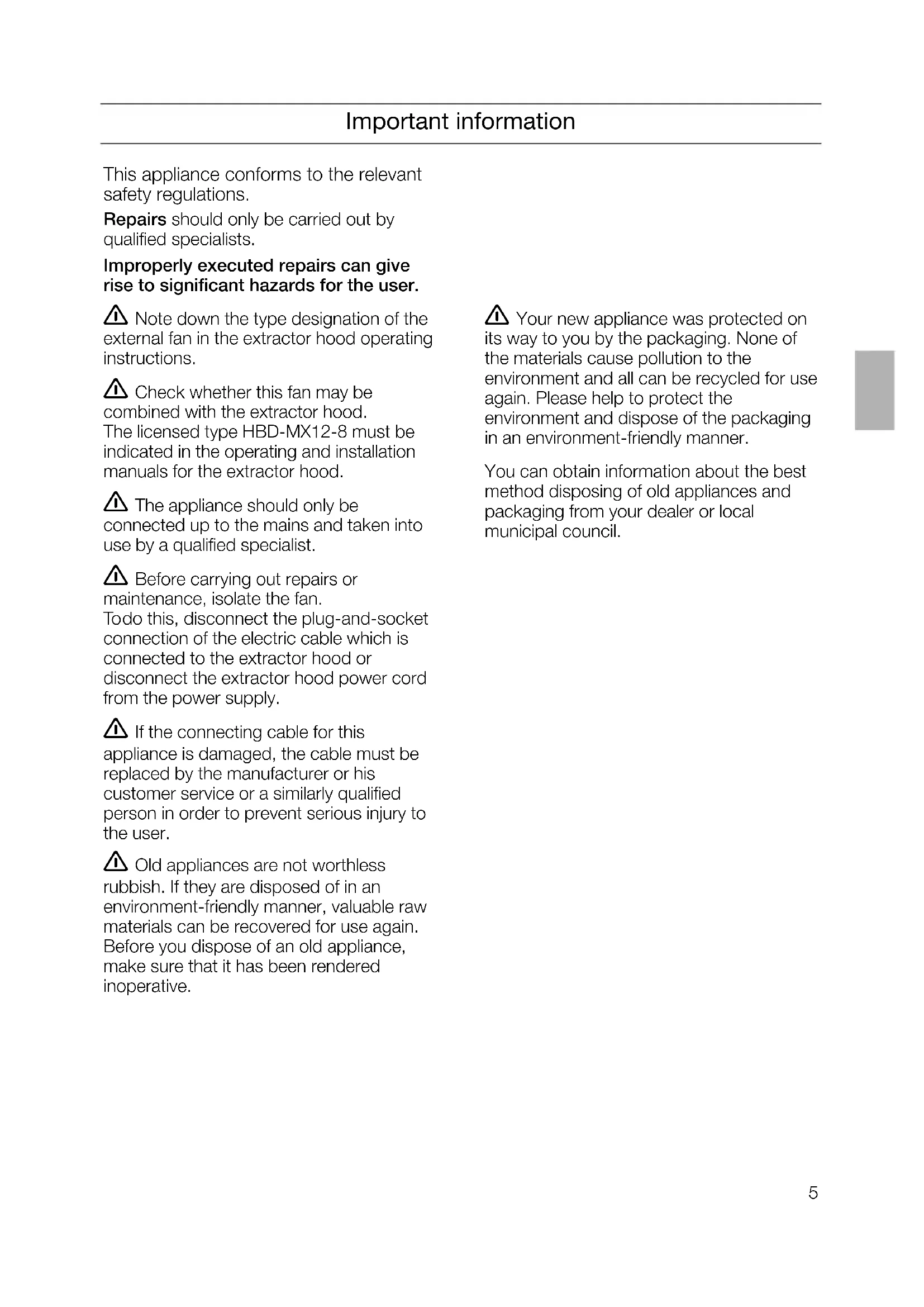 Dunstabzugshaube herstellen. Die Zusatzabdeckung am Stecker muss aus Sicherheitsgründen immer angebracht und geschlossen sein.5 Important information This appliance conforms to the relevant safety regulations. Repairs should only be carried out by qualified specialists. Improperly executed repairs can give rise to significant hazards for the user. Note down the type designation of the external fan in the extractor hood operating instructions. Check whether this fan may be combined with the extractor hood. The licensed type HBD-MX12-8 must be indicated in the operating and installation manuals for the extractor hood. The appliance should only be connected up to the mains and taken into use by a qualified specialist. Before carrying out repairs or maintenance, isolate the fan. To do this, disconnect the plug-and-socket connection of the electric cable which is connected to the extractor hood or disconnect the extractor hood power cord from the power supply. If the connecting cable for this appliance is damaged, the cable must be replaced by the manufacturer or his customer service or a similarly qualified person in order to prevent serious injury to the user. Old appliances are not worthless rubbish. If they are disposed of in an environment-friendly manner, valuable raw materials can be recovered for use again. Before you dispose of an old appliance, make sure that it has been rendered inoperative. This appliance conforms to the relevant safety regulations. Repairs should only be carried out by qualified specialists. Improperly executed repairs can give rise to significant hazards for the user. Your new appliance was protected on its way to you by the packaging. None of the materials cause pollution to the environment and all can be recycled for use again. Please help to protect the environment and dispose of the packaging in an environment-friendly manner. You can obtain information about the best method disposing of old appliances and packaging from your dealer or local municipal council.6 Prior to installation