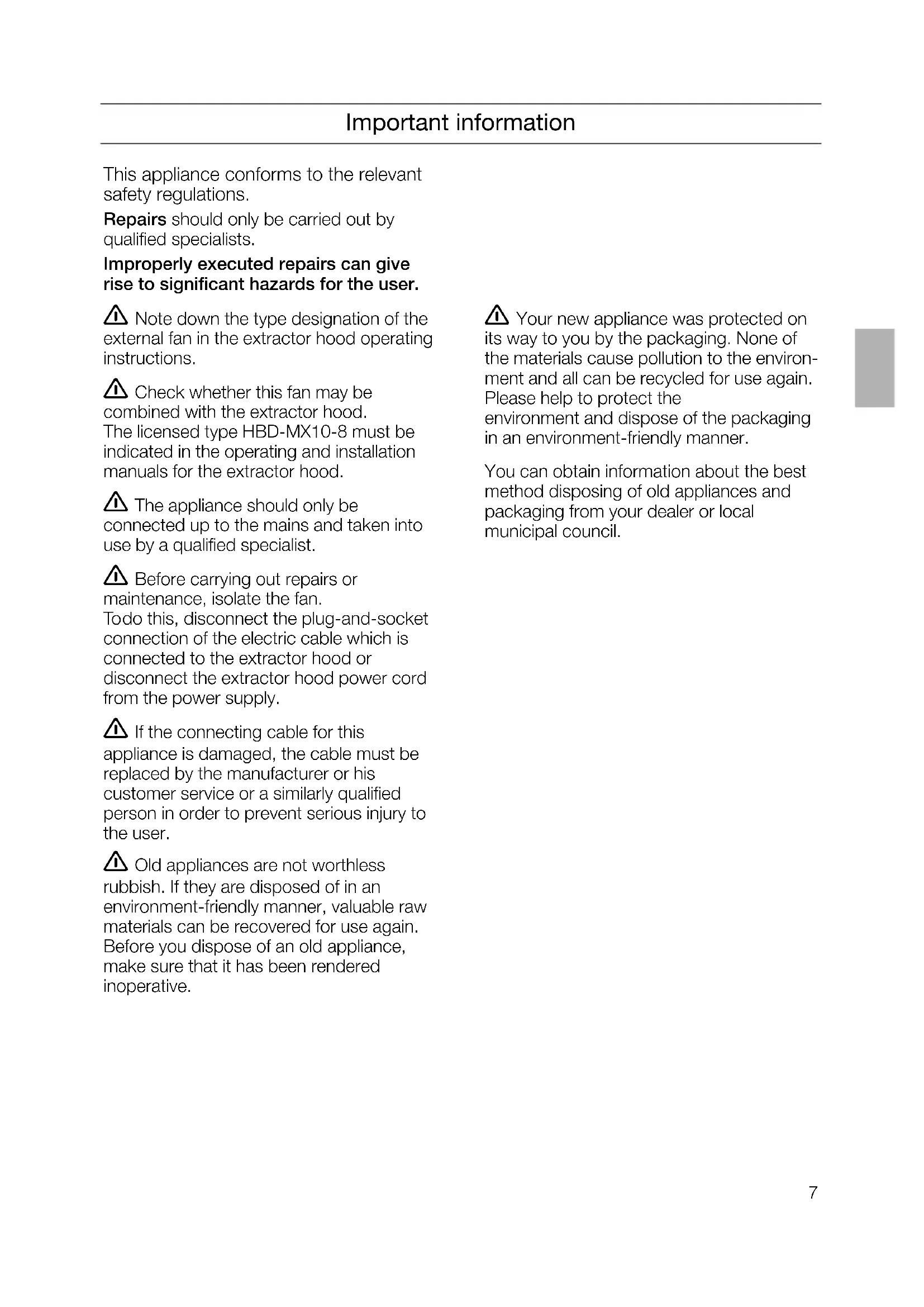 Verbindung vom Gebläse zur Dunstabzugshaube herstellen. 몇 Die Zusatzabdeckung am Stecker muss aus Sicherheitsgründen immer angebracht und geschlossen sein.7 Important information This appliance conforms to the relevant safety regulations. Repairs should only be carried out by qualified specialists. Improperly executed repairs can give rise to significant hazards for the user. 몇 Note down the type designation of the external fan in the extractor hood operating instructions. 몇 Check whether this fan may be combined with the extractor hood. The licensed type HBD-MX10-8 must be indicated in the operating and installation manuals for the extractor hood. 몇 The appliance should only be connected up to the mains and taken into use by a qualified specialist. 몇 Before carrying out repairs or maintenance, isolate the fan. To do this, disconnect the plug-and-socket connection of the electric cable which is connected to the extractor hood or disconnect the extractor hood power cord from the power supply. 몇 If the connecting cable for this appliance is damaged, the cable must be replaced by the manufacturer or his customer service or a similarly qualified person in order to prevent serious injury to the user. 몇 Old appliances are not worthless rubbish. If they are disposed of in an environment-friendly manner, valuable raw materials can be recovered for use again. Before you dispose of an old appliance, make sure that it has been rendered inoperative. This appliance conforms to the relevant safety regulations. Repairs should only be carried out by qualified specialists. Improperly executed repairs can give rise to significant hazards for the user. 몇 Your new appliance was protected on its way to you by the packaging. None of the materials cause pollution to the environ- ment and all can be recycled for use again. Please help to protect the environment and dispose of the packaging in an environment-friendly manner. You can obtain information about the best method disposing of old appliances and packaging from your dealer or local municipal council.8 Prior to installation
