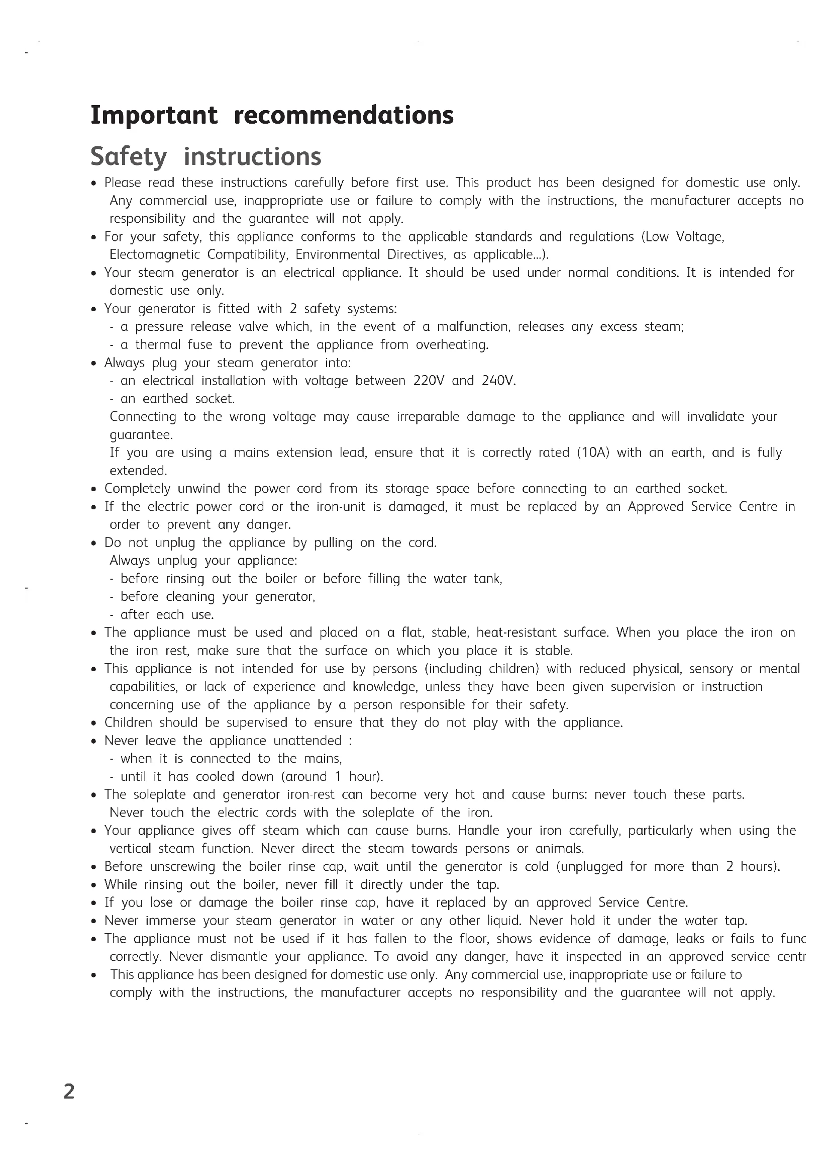 - Your steam generator is an electrical appliance. It should be used under normal conditions. It is intended for domestic use only.