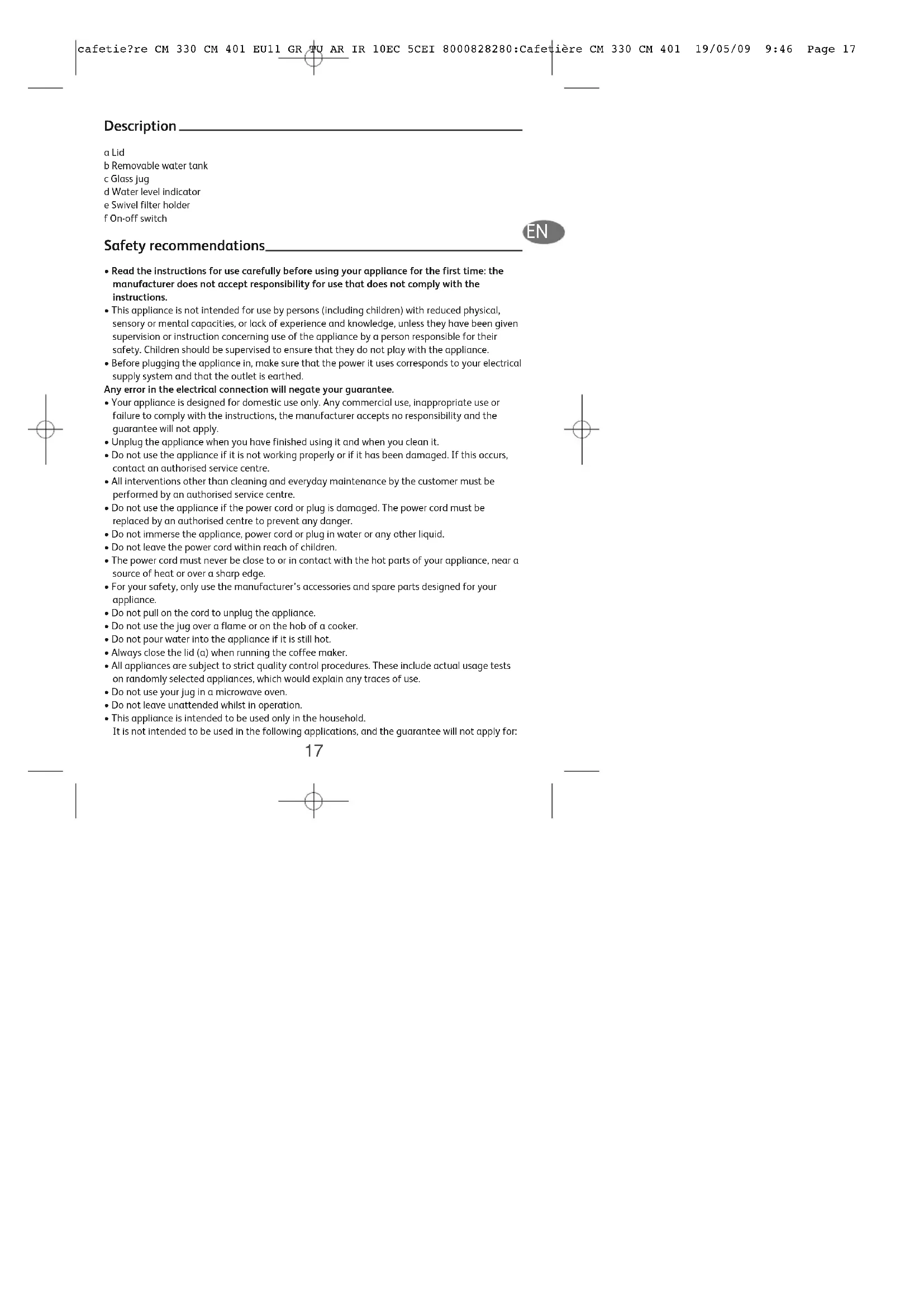 cafetie?re CM 330 CM 401 EU11 GR TU AR IR 10EC 5CEI 8000828280:Cafetière CM 330 CM 401 19/05/09 9:46 Page 17- staff kitchen areas in shops, offices and other working environments; - farm houses; - by clients in hotels, motels and other residential type environments; - bed and breakfast type environments. Before using for the first time