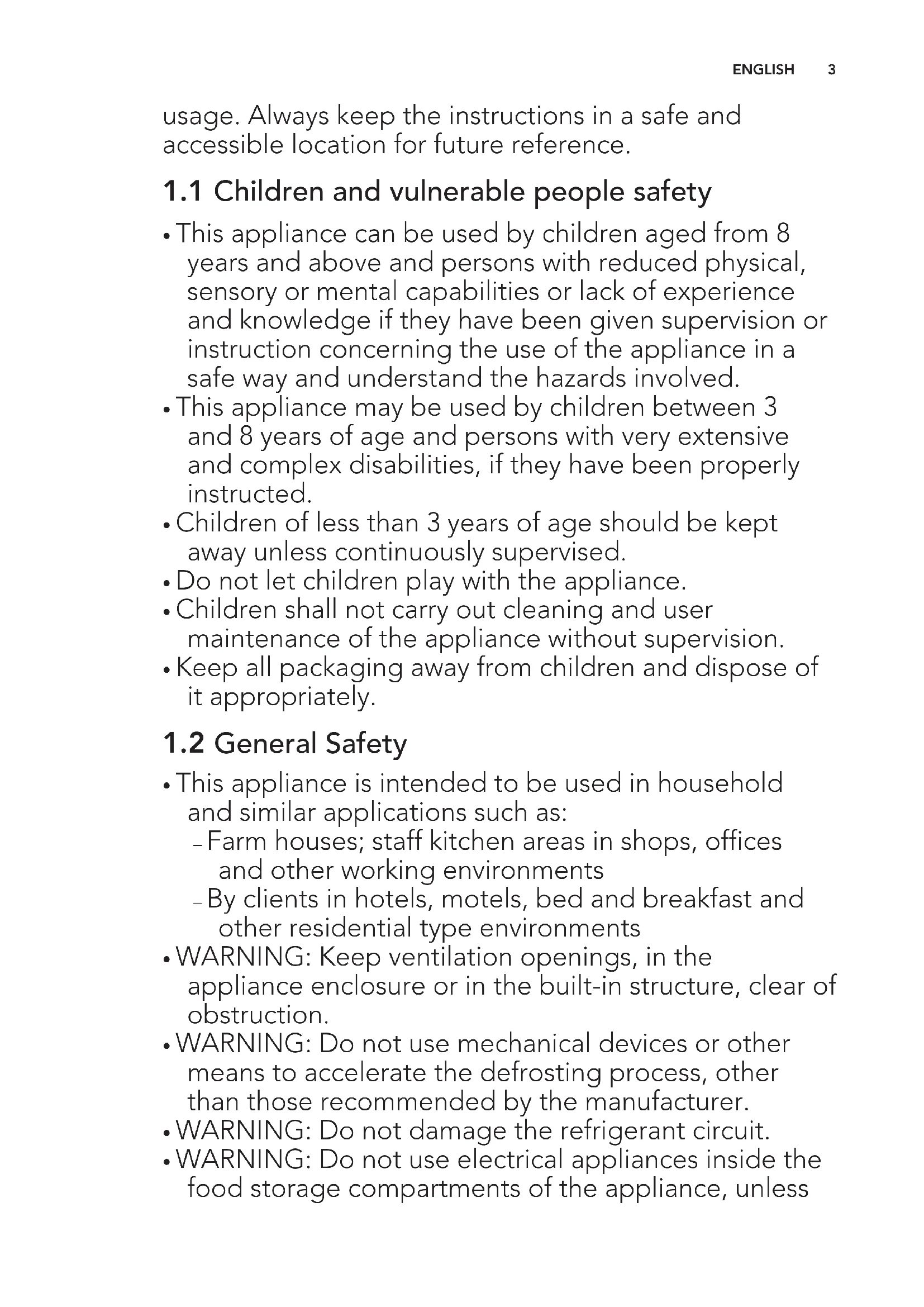 SAFETY INFORMATION Before the installation and use of the appliance, carefully read the supplied instructions. The manufacturer is not responsible for any injuries or damages that are the result of incorrect installation or www.aeg.com 2usage. Always keep the instructions in a safe and accessible location for future reference.