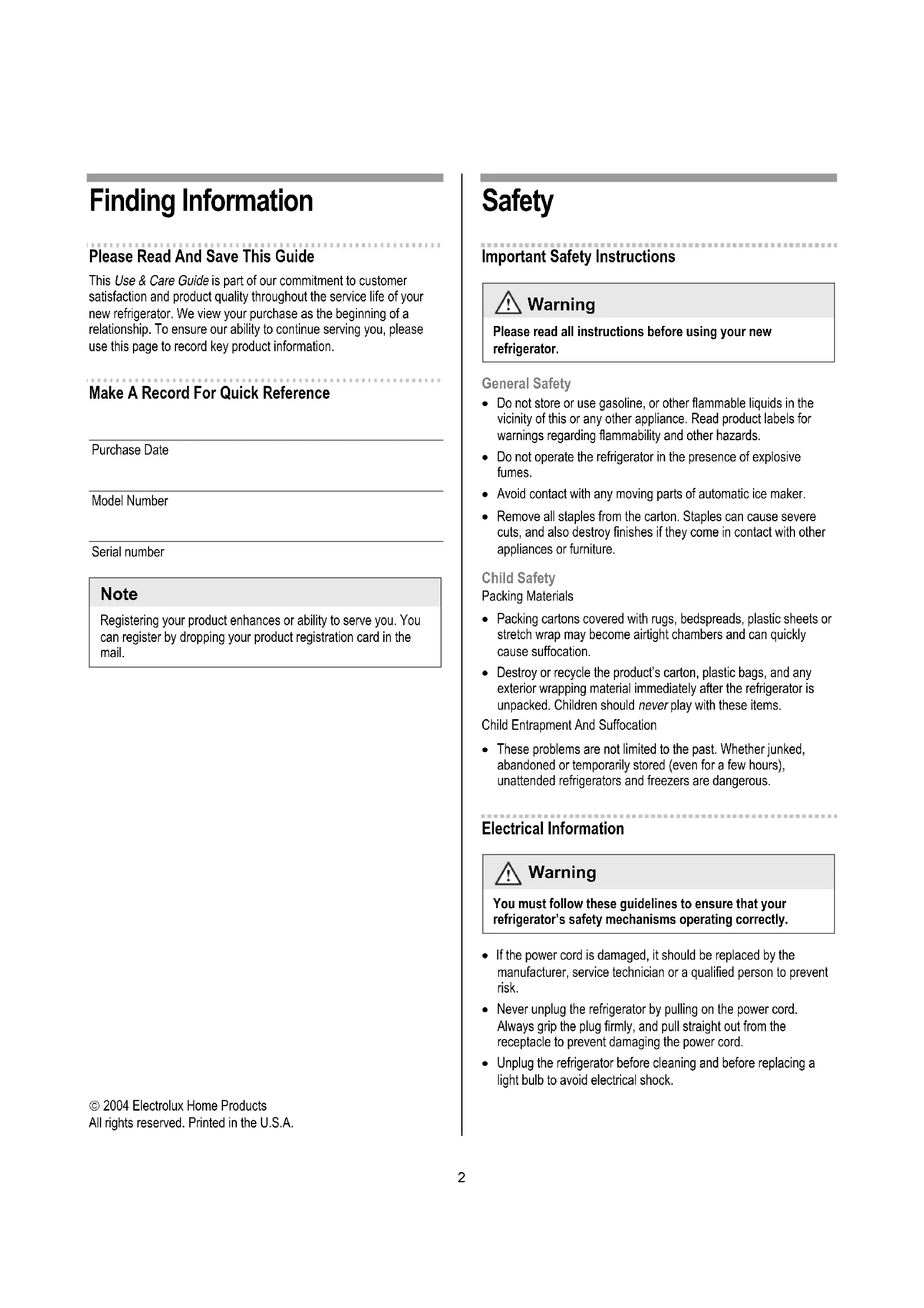 © 2004 Electrolux Home Products All rights reserved. Printed in the U.S.A. Safety Important Safety Instructions Warning Please read all instructions before using your new refrigerator. General Safety