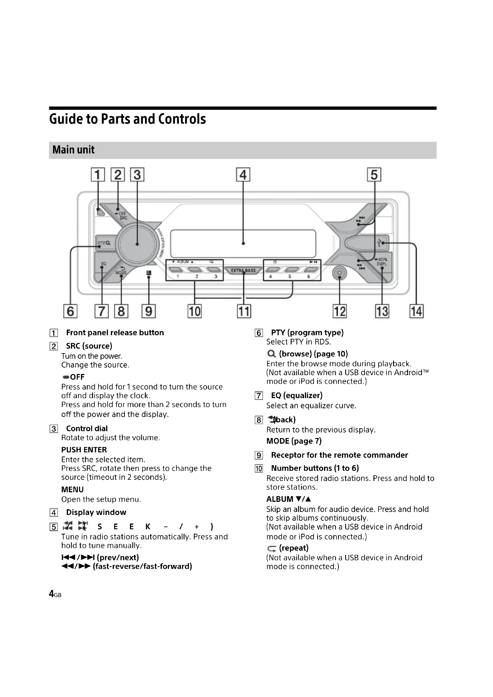 - Installation Warning if your car’s ignition has no ACC position Be sure to set the AUTO OFF function (page 11). The unit will shut off completely and automatically in the set time after the unit is turned off, which prevents battery drain. If you do not set the AUTO OFF function, press and hold OFF until the display disappears each time you turn the ignition off.4GB Guide to Parts and Controls Front panel release button SRC (source) Turn on the power. Change the source. OFF Press and hold for 1 second to turn the source off and display the clock. Press and hold for more than 2 seconds to turn off the power and the display. Control dial Rotate to adjust the volume. PUSH ENTER Enter the selected item. Press SRC, rotate then press to change the source (timeout in 2 seconds). MENU Open the setup menu. Display window / (SEEK –/+) Tune in radio stations automatically. Press and hold to tune manually. / (prev/next) / (fast-reverse/fast-forward) PTY (program type) Select PTY in RDS. (browse) (page 10) Enter the browse mode during playback. (Not available when a USB device in Android™ mode or iPod is connected.) EQ (equalizer) Select an equalizer curve. (back) Return to the previous display. MODE (page 7) Receptor for the remote commander Number buttons (1 to 6) Receive stored radio stations. Press and hold to store stations. ALBUM / Skip an album for audio device. Press and hold to skip albums continuously. (Not available when a USB device in Android mode or iPod is connected.) (repeat) (Not available when a USB device in Android mode is connected.) Main unit5GB (shuffle)(Not available when a USB device in Android mode is connected.) (play/pause) EXTRA BASSReinforces bass sound in synchronization with the volume level. Press to change the EXTRA BASS setting: [1], [2], [OFF]. AUX input jack DSPL (display)Press to change display items.SCRL (scroll)Press and hold to scroll a display item. USB port Detaching the Front Panel You can detach the front panel of this unit to prevent theft. 1 Press and hold OFF until the unit turns off, press the front panel release button , then pull the panel towards you to remove. Caution alarmIf you turn the ignition switch to the OFF position without detaching the front panel, the caution alarm will sound for a few seconds. The alarm will only sound if the built-in amplifier is used. Getting Started Attaching the front panel6GB Resetting the Unit Before operating the unit for the first time, or after replacing the car battery or changing connections, you must reset the unit. 1 Press DSPL and (back)/MODE for more than 2 seconds. Note Resetting the unit will erase the clock setting and some stored contents. Setting the area/region After resetting the unit, the area/region setting display appears. 1 Press ENTER while [SET AREA] is displayed. The area/region currently set appears. 2 Rotate the control dial to select [EUROPE] or [RUSSIA], then press it. 3 Rotate the control dial to select [YES] or [NO], then press it. If the setting area/region is changed, the unit is reset, then the clock is displayed.This setting can be configured in the general setup menu (page 11). Setting the Clock 1 Press MENU, rotate the control dial to select [GENERAL], then press it. 2 Rotate the control dial to select [SET CLOCK-ADJ], then press it. The hour indication flashes. 3 Rotate the control dial to set the hour and minute. To move the digital indication, press / (SEEK –/+). 4 After setting the minute, press MENU. The setup is complete and the clock starts.To display the clockPress DSPL. Checking the Battery Voltage You can check the current battery voltage. (Not available while the source is off and the clock is displayed.) 1 Press DSPL repeatedly until the battery voltage display appears. Connecting a USB Device 1 Turn down the volume on the unit. 2 Connect the USB device to the unit. To connect an iPod/iPhone, use the USB connection cable for iPod (not supplied).7GB Connecting Other Portable Audio Device 1 Turn off the portable audio device. 2 Turn down the volume on the unit. 3 Connect the portable audio device to the AUX input jack (stereo mini jack) on the unit with a connecting cord (not supplied)*. p. 22