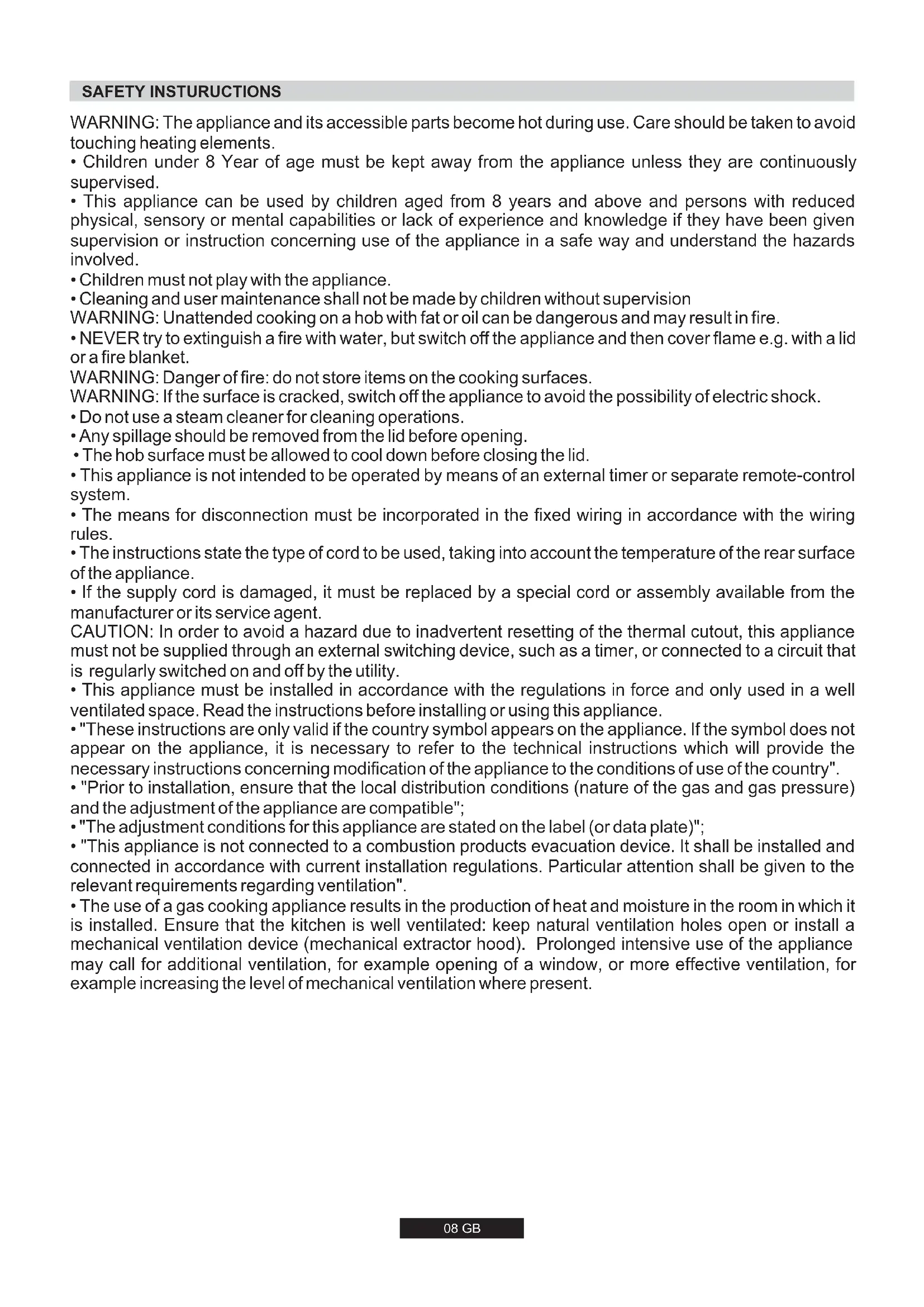 This appliance must only be used for the purpose for which it is intended, domestic cooking, and any other use will be considered improper and could therefore be dangerous. The Manufacturer will not be responsible for any damage or loss resulting from improper use.