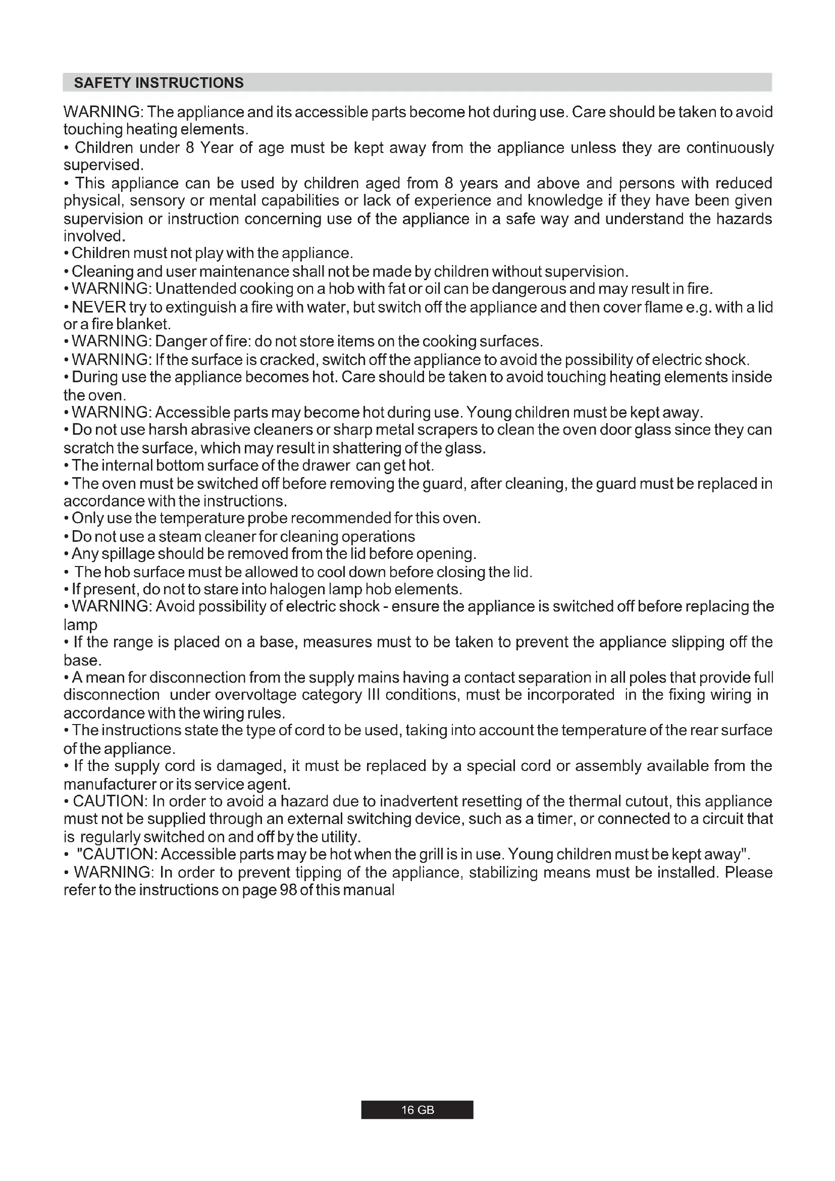- WARNING: In order to prevent tipping of the appliance, stabilizing means must be installed. Please refer to the instructions on page 98 of this manual