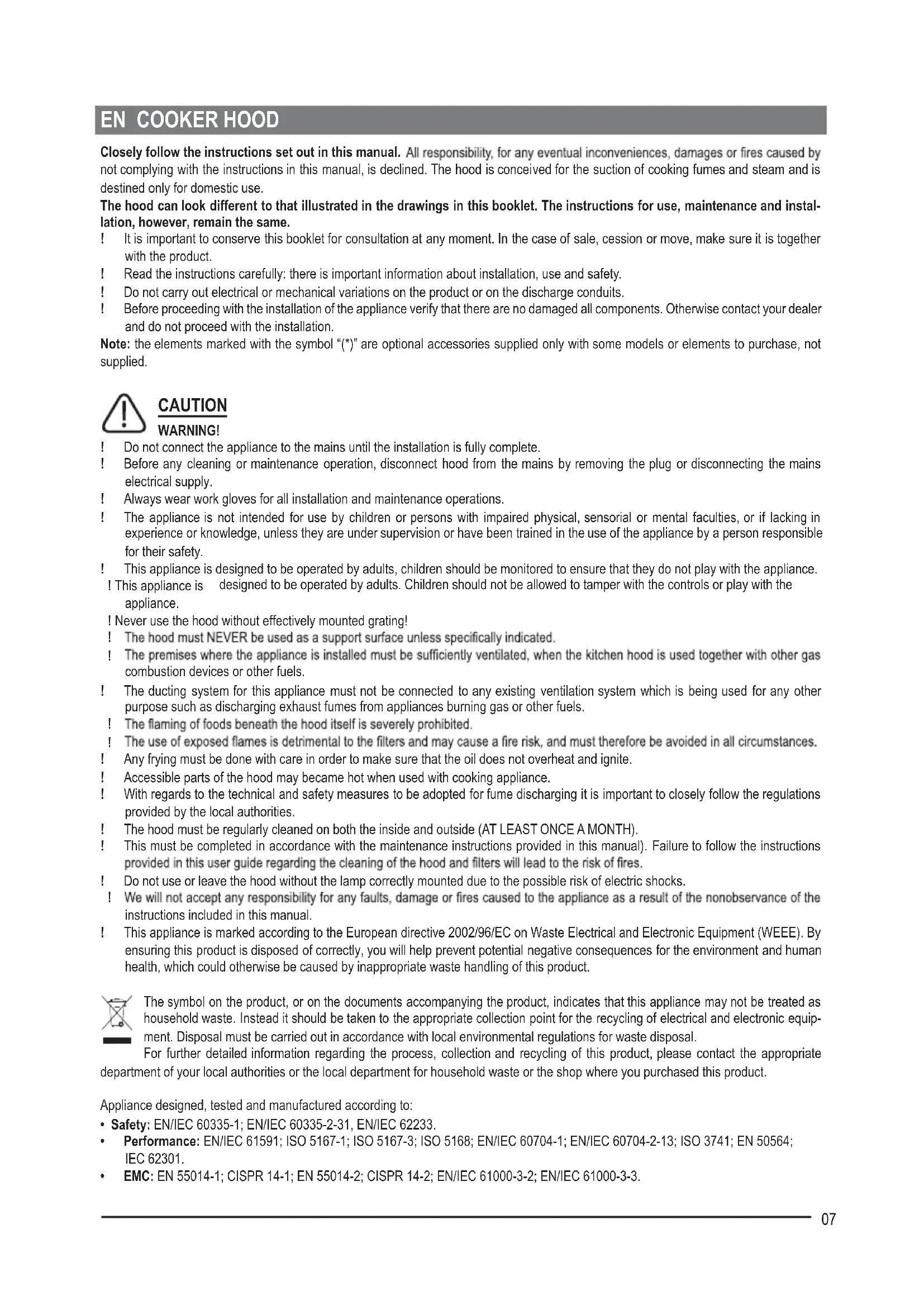 Closely follow the instructions set out in this manual. not complying with the instructions in this manual, is declined. The hood is conceived for the suction of cooking fumes and steam and is destined only for domestic use. The hood can look different to that illustrated in the drawings in this booklet. The instructions for use, maintenance and instal- lation, however, remain the same. ! It is important to conserve this booklet for consultation at any moment. In the case of sale, cession or move, make sure it is together with the product. ! Read the instructions carefully: there is important information about installation, use and safety. ! Do not carry out electrical or mechanical variations on the product or on the discharge conduits. ! Before proceeding with the installation of the appliance verify that there are no damaged all components. Otherwise contact your dealer and do not proceed with the installation. Note: the elements marked with the symbol “(*)” are optional accessories supplied only with some models or elements to purchase, not supplied. CAUTION WARNING! ! Do not connect the appliance to the mains until the installation is fully complete. ! Before any cleaning or maintenance operation, disconnect hood from the mains by removing the plug or disconnecting the mains electrical supply. ! Always wear work gloves for all installation and maintenance operations. ! The appliance is not intended for use by children or persons with impaired physical, sensorial or mental faculties, or if lacking in experience or knowledge, unless they are under supervision or have been trained in the use of the appliance by a person responsible for their safety. ! This appliance is designed to be operated by adults, children should be monitored to ensure that they do not play with the appliance. ! This appliance is designed to be operated by adults. Children should not be allowed to tamper with the controls or play with the appliance. ! Never use the hood without effectively mounted grating!
