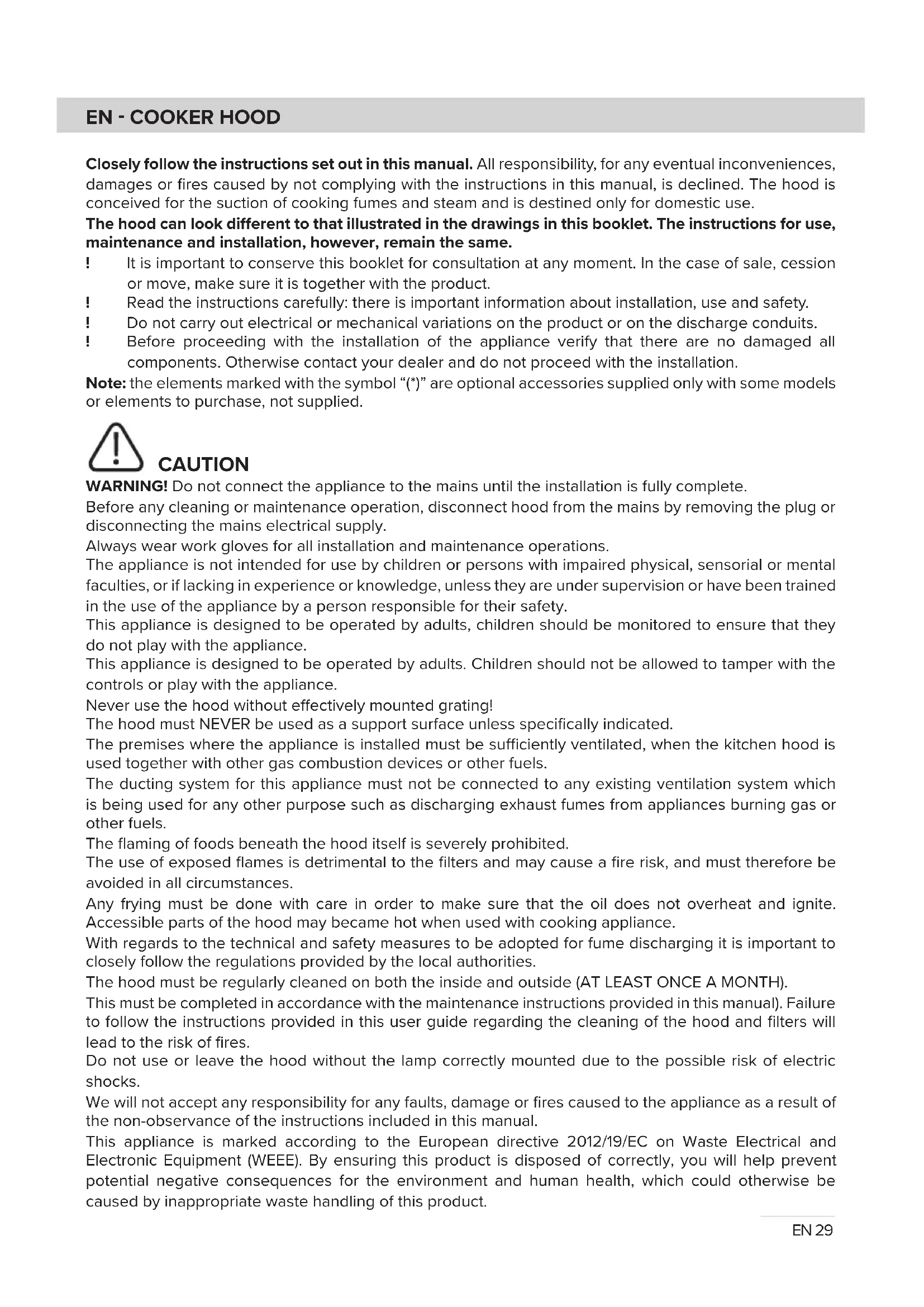 Closely follow the instructions set out in this manual. All responsibility, for any eventual inconveniences, damages or fires caused by not complying with the instructions in this manual, is declined. The hood is conceived for the suction of cooking fumes and steam and is destined only for domestic use. The hood can look dierent to that illustrated in the drawings in this booklet. The instructions for use, maintenance and installation, however, remain the same. ! It is important to conserve this booklet for consultation at any moment. In the case of sale, cession or move, make sure it is together with the product. ! Read the instructions carefully: there is important information about installation, use and safety. ! Do not carry out electrical or mechanical variations on the product or on the discharge conduits. ! Before proceeding with the installation of the appliance verify that there are no damaged all components. Otherwise contact your dealer and do not proceed with the installation. Note: the elements marked with the symbol “(*)” are optional accessories supplied only with some models or elements to purchase, not supplied. CAUTION WARNING! Do not connect the appliance to the mains until the installation is fully complete. Before any cleaning or maintenance operation, disconnect hood from the mains by removing the plug or disconnecting the mains electrical supply. Always wear work gloves for all installation and maintenance operations. The appliance is not intended for use by children or persons with impaired physical, sensorial or mental faculties, or if lacking in experience or knowledge, unless they are under supervision or have been trained in the use of the appliance by a person responsible for their safety. This appliance is designed to be operated by adults, children should be monitored to ensure that they do not play with the appliance. This appliance is designed to be operated by adults. Children should not be allowed to tamper with the controls or play with the appliance. Never use the hood without eectively mounted grating! The hood must NEVER be used as a support surface unless specifically indicated. The premises where the appliance is installed must be suciently ventilated, when the kitchen hood is used together with other gas combustion devices or other fuels. The ducting system for this appliance must not be connected to any existing ventilation system which is being used for any other purpose such as discharging exhaust fumes from appliances burning gas or other fuels. The flaming of foods beneath the hood itself is severely prohibited. The use of exposed flames is detrimental to the filters and may cause a fire risk, and must therefore be avoided in all circumstances. Any frying must be done with care in order to make sure that the oil does not overheat and ignite. Accessible parts of the hood may became hot when used with cooking appliance. With regards to the technical and safety measures to be adopted for fume discharging it is important to closely follow the regulations provided by the local authorities. The hood must be regularly cleaned on both the inside and outside (AT LEAST ONCE A MONTH). This must be completed in accordance with the maintenance instructions provided in this manual). Failure to follow the instructions provided in this user guide regarding the cleaning of the hood and filters will lead to the risk of fires. Do not use or leave the hood without the lamp correctly mounted due to the possible risk of electric shocks. We will not accept any responsibility for any faults, damage or fires caused to the appliance as a result of the non-observance of the instructions included in this manual. This appliance is marked according to the European directive 2012/19/EC on Waste Electrical and Electronic Equipment (WEEE). By ensuring this product is disposed of correctly, you will help prevent potential negative consequences for the environment and human health, which could otherwise be caused by inappropriate waste handling of this product.EN30 The symbol on the product, or on the documents accompanying the product, indicates that this appliance may not be treated as household waste. Instead it should be taken to the appropriate collection point for the recycling of electrical and electronic equipment. Disposal must be carried out in accordance with local environmental regulations for waste disposal. For further detailed information regarding the process, collection and recycling of this product, please contact the appropriate department of your local authorities or the local department for household waste or the shop where you purchased this product. Appliance designed, tested and manufactured according to: