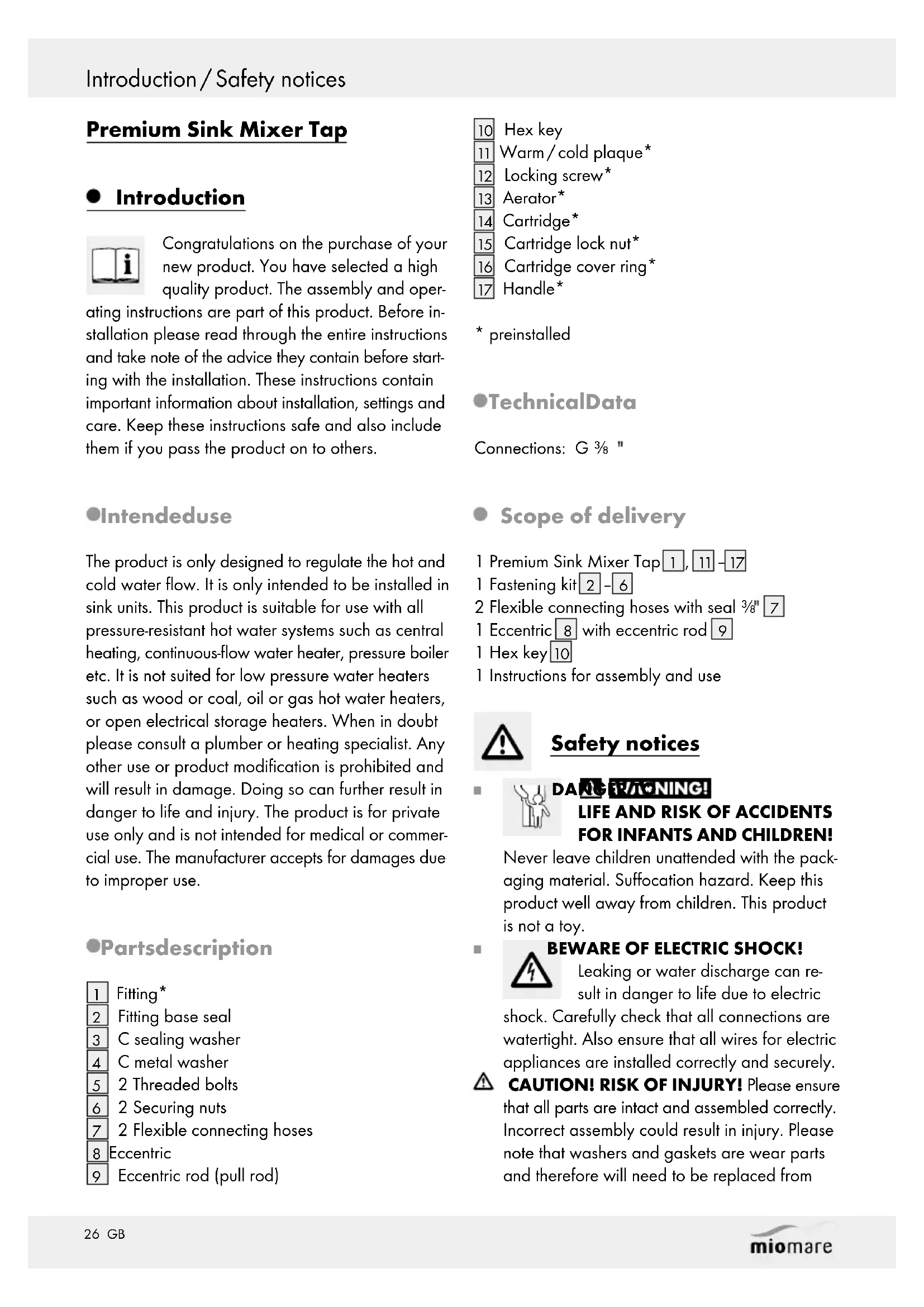 FOR INFANTS AND CHILDREN! Never leave children unattended with the pack- aging material. Suffocation hazard. Keep this product well away from children. This product is not a toy. BEWARE OF ELECTRIC SHOCK! Leaking or water discharge can re- sult in danger to life due to electric shock. Carefully check that all connections are watertight. Also ensure that all wires for electric appliances are installed correctly and securely. CAUTION! RISK OF INJURY! Please ensure that all parts are intact and assembled correctly. Incorrect assembly could result in injury. Please note that washers and gaskets are wear parts and therefore will need to be replaced from Safety notices / Installation27 GB Introduction / Safety notices Safety notices / Installation time to time. Damaged parts could impact s afety and function. Be sure all seals are correctly seated. CAUTION! Be careful not to reverse the hot / cold water plaque