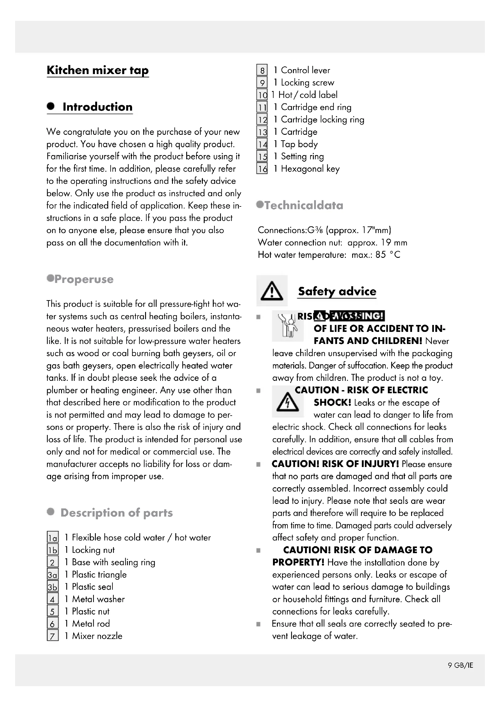 PROPERTY! Have the installation done by experienced persons only. Leaks or escape of water can lead to serious damage to buildings or household fittings and furniture. Check all connections for leaks carefully. Ensure that all seals are correctly seated to pre- vent leakage of water.10 GB/IE The spout can be swiveled to your desired position. Make sure the spout is always posi- tioned within the area of the sink, otherwise escape of water can lead to serious flooding to your house or building. CAUTION! DANGER OF SCALDING! When making the hot water setting please ensure that the temperature of the water is not too high. Before installation, make yourself familiar with all the existing services, e.g. water connection and stopcocks. Please read carefully through these operating instructions before installing and using the product. Keep all the safety advice and instruc- tions in a safe place for future reference! Installation Installing the tap Turn off the main water supply to prevent serious leakage of water. Allow any remaining water in the pipework to drain. Install the tap as shown in Figs. A–D. CAUTION! Do not bend the hoses or place them under tension. Otherwise material dam- age could result. Flushing the tap The tap must be flushed through before first use to remove any dirt. To do this, follow these steps (see Fig. F): Screw the mixer nozzle