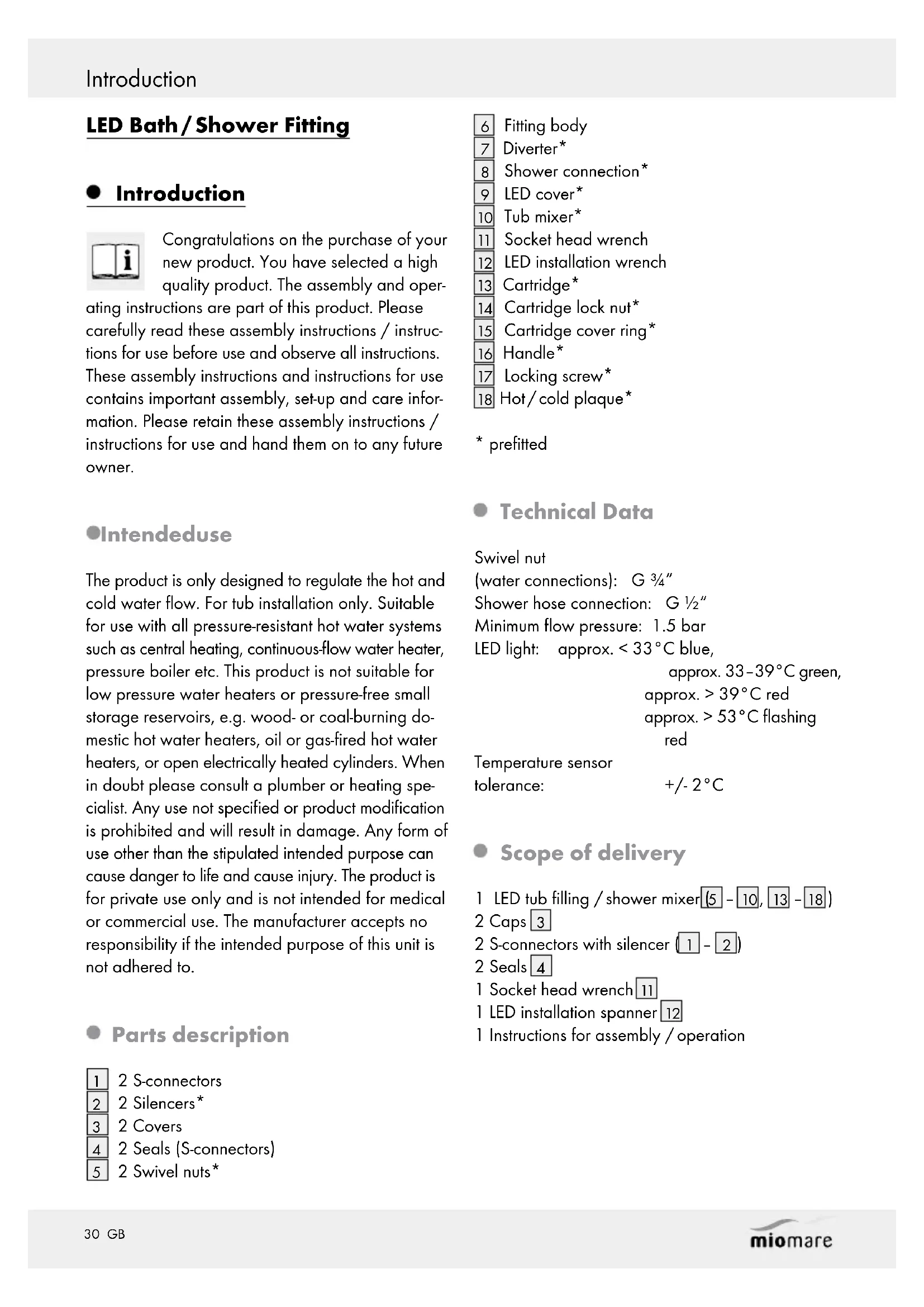 - prefitted Technical Data Swivel nut (water connections): G ¾“ Shower hose connection: G ½“ Minimum flow pressure: 1.5 bar LED light: approx. < 33°C blue, approx. 33–39°C green, approx. > 39°C red approx. > 53°C flashing red Temperature sensor tolerance: +/- 2°C Scope of delivery 1 LED tub filling / shower mixer (