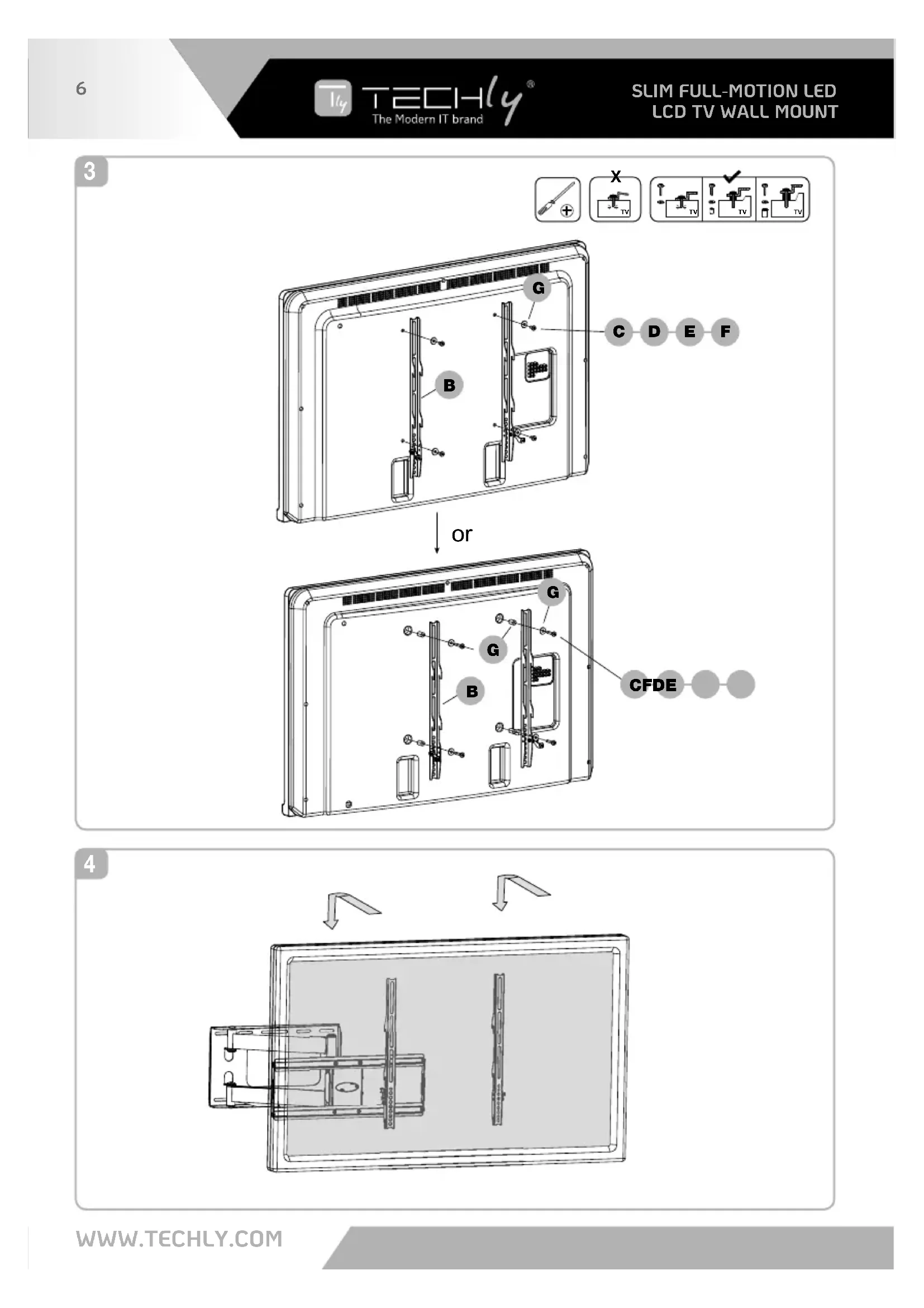 Dear Customer, thanks for choosing a Techly product.Unpacking Instructions• Carefully open the carton, remove contents and lay out on cardboard or other protective surface to avoid damage.• Check package contents against the Supplied Parts List in the next page to assure that all components were received undamaged. Do not use damaged or defective parts.• Carefully read all instructions before attempting installation.• Please keep this user's manual for future consultations.Note: Recommended mounting surfaces: wooden studs and solid-at concrete. Please consult your installer and/or specialist supplier. We cannot be held responsible for any injury and/or damage caused by incorrect installation. Before proceeding, please make sure the wall is suitable for installation. Respect the maximum load capacity indicated on the box of the product.ImportantSafety InformationPlease read this instruction before beginning the installation, and carefully follow all herein contained recommendations. Use proper safety equipment during installation. Please call a qualied installation contractor for help if you:• Don't understand these directions or have any doubts about the safety of the installation.