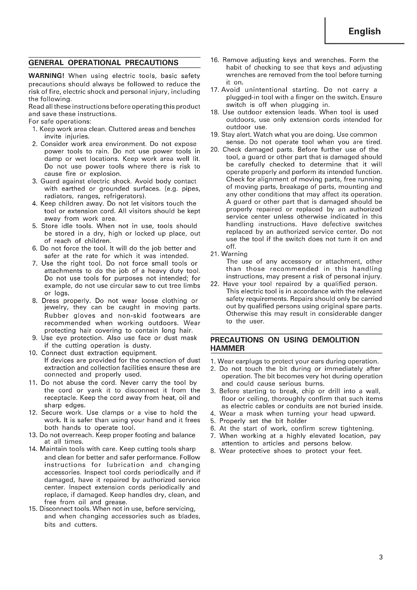 - Be sure to check the nameplate on product as it is subject to change by areas. STANDARD ACCESSORIES (1) Case ............................................................................ 1 (2) Bull Point ................................................................... 1 (3) Hexagon Bar Wrench (for 8mm bolt) .................. 1 (4) Hexagon Bar Wrench (for 4mm bolt) .................. 1 Standard accessories are subject to change without notice. OPTIONAL ACCESSORIES (sold separately) 䡬 Asphalt Cutting 䡬 Groove Digging and Edging 䡬 Tamping 䡬 Scooping Work 䡬 Grease 500g (in a can) 30g (in a tube) Optional accessories are subject to change without notice. APPLICATIONS Demolishing concrete, chiseling off concrete, grooving, bar cutting. Application examples: Installation of piping and wiring, sanitary facility installation, machinery installation, water supply and drainage work, interior jobs, harbor facilities and other civil engineering works.