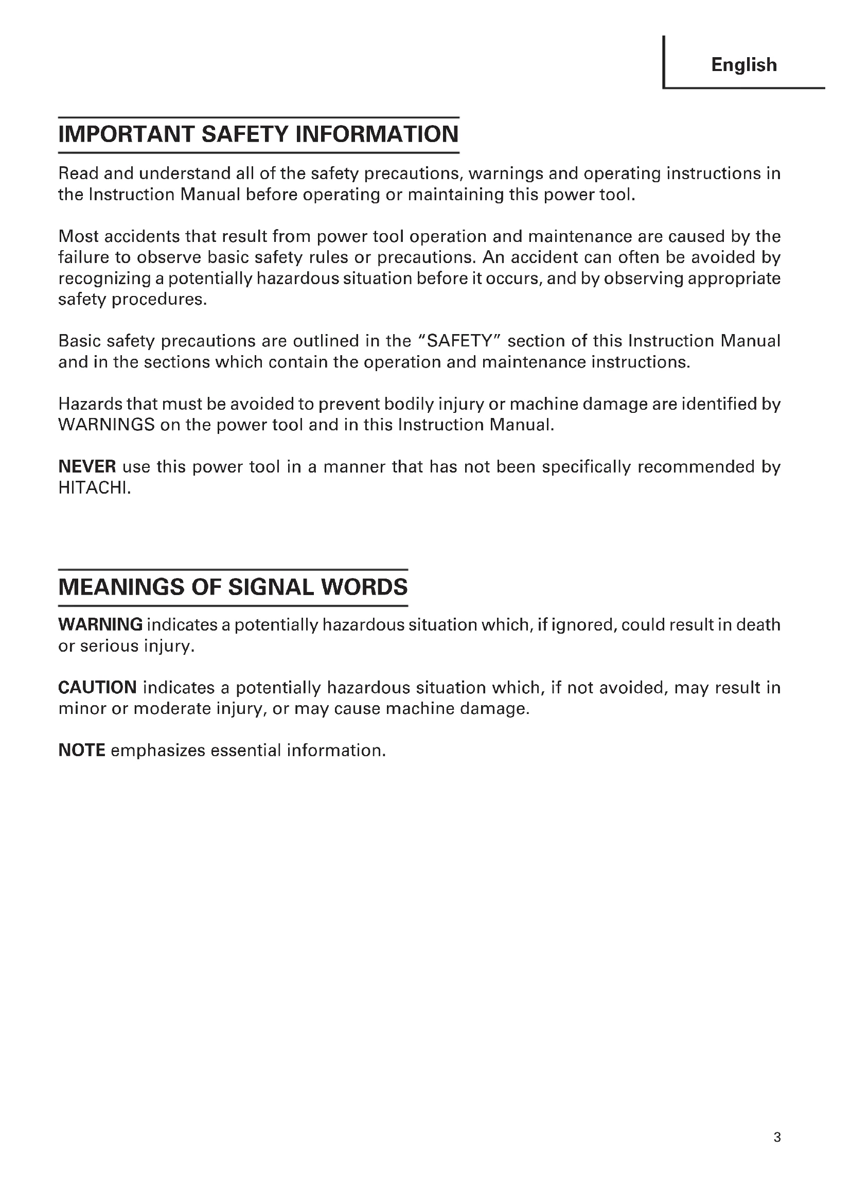 Read and understand all of the safety precautions, warnings and operating instructions in the Instruction Manual before operating or maintaining this power tool. Most accidents that result from power tool operation and maintenance are caused by the failure to observe basic safety rules or precautions. An accident can often be avoided by recognizing a potentially hazardous situation before it occurs, and by observing appropriate safety procedures. Basic safety precautions are outlined in the “SAFETY” section of this Instruction Manual and in the sections which contain the operation and maintenance instructions. Hazards that must be avoided to prevent bodily injury or machine damage are identified by WARNINGS on the power tool and in this Instruction Manual. NEVER use this power tool in a manner that has not been specifically recommended by HITACHI.