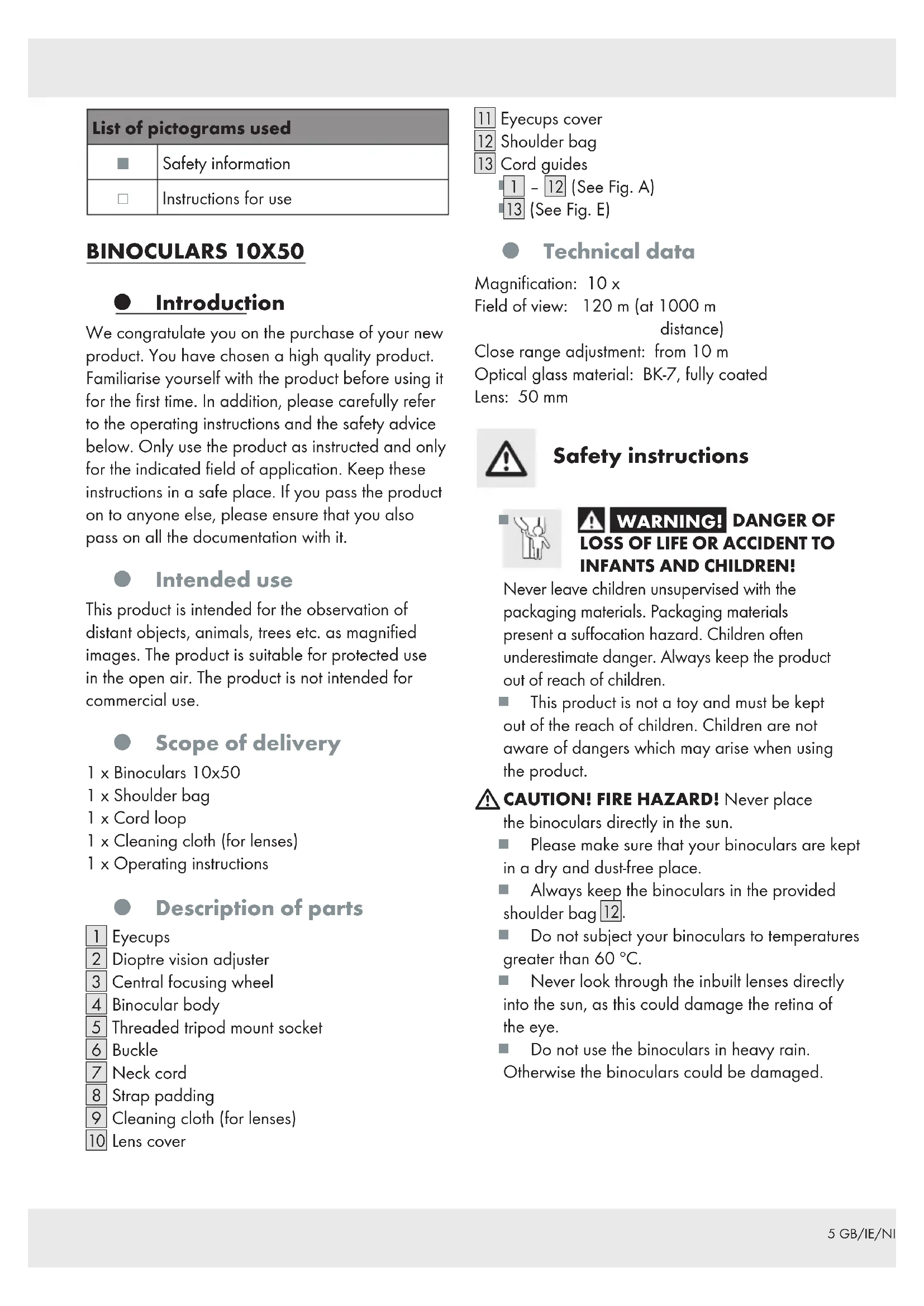 Instructions for use BINOCULARS 10X50 Introduction We congratulate you on the purchase of your new product. You have chosen a high quality product. Familiarise yourself with the product before using it for the first time. In addition, please carefully refer to the operating instructions and the safety advice below. Only use the product as instructed and only for the indicated field of application. Keep these instructions in a safe place. If you pass the product on to anyone else, please ensure that you also pass on all the documentation with it. Intended use This product is intended for the observation of distant objects, animals, trees etc. as magnified images. The product is suitable for protected use in the open air. The product is not intended for commercial use. Scope of delivery 1 x Binoculars 10x50 1 x Shoulder bag 1 x Cord loop 1 x Cleaning cloth (for lenses) 1 x Operating instructions Description of parts [1] Eyecups [2] Dioptre vision adjuster [3] Central focusing wheel [4] Binocular body [5] Threaded tripod mount socket [6] Buckle [7] Neck cord [8] Strap padding [9] Cleaning cloth (for lenses) [] Lens cover [] Eyecups cover [] Shoulder bag [] Cord guides