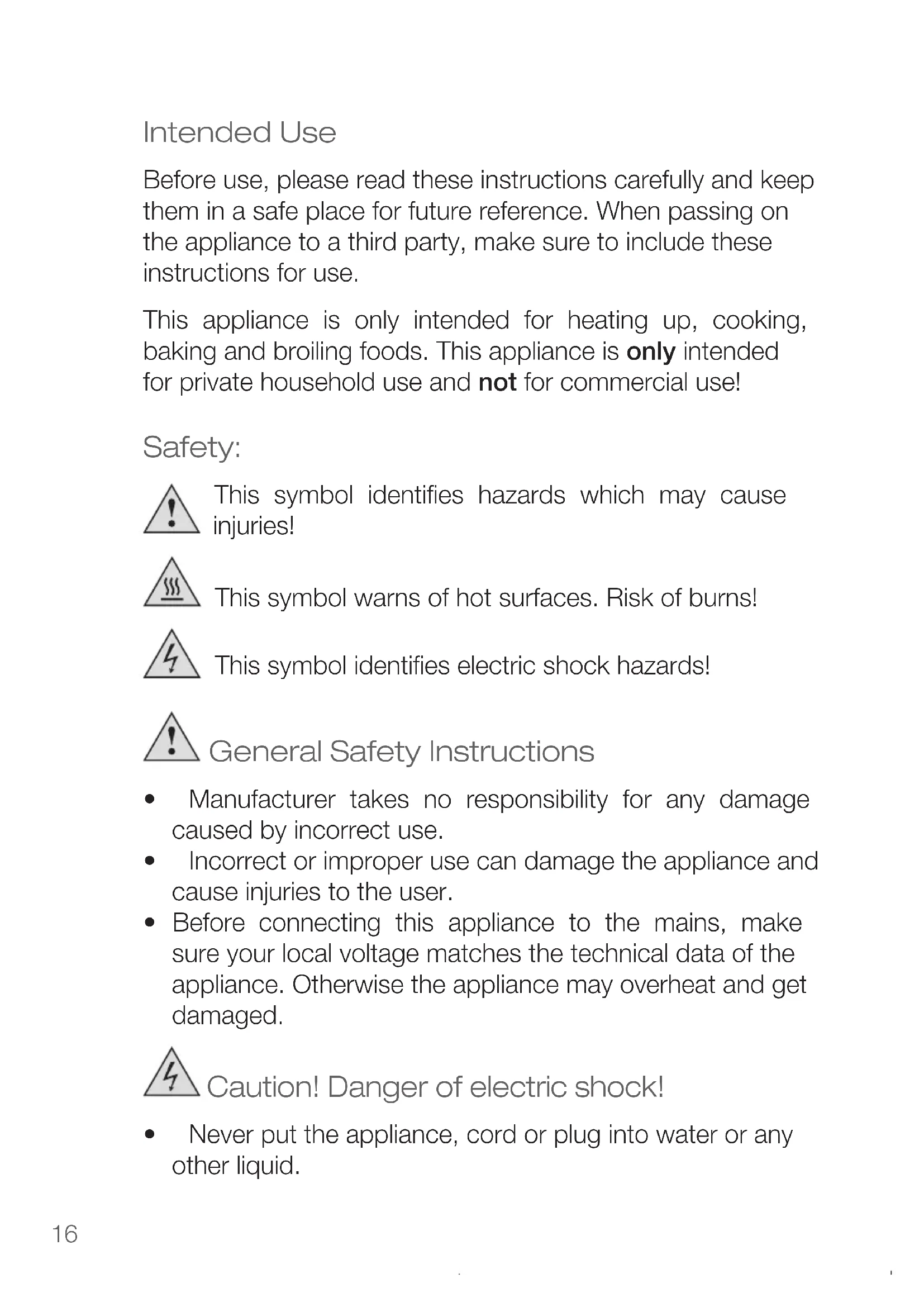 - Before connecting this appliance to the mains, make sure your local voltage matches the technical data of the appliance. Otherwise the appliance may overheat and get damaged. Caution! Danger of electric shock!