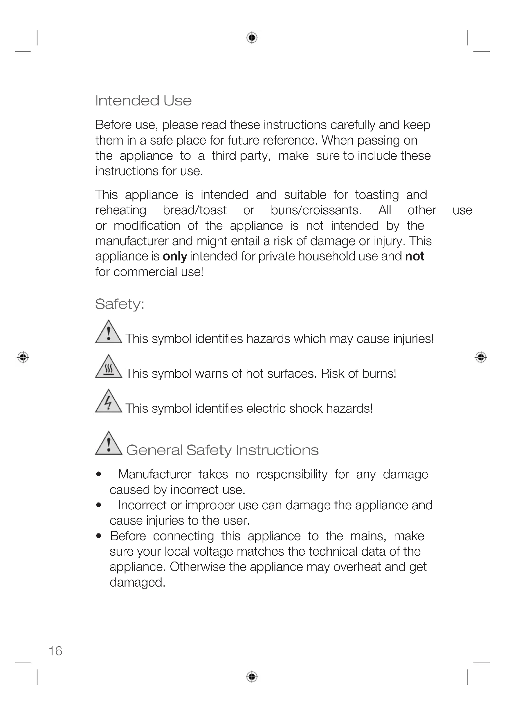 Attention: Toasted bread can be very hot. Let it cool down or use potholders to handle it. If a slice of bread should get stuck during the toasting process, unplug the appliance and let it cool down completely, before trying to remove it. Do not use any sharp metal objects to do so. During operation, bread crumbs are falling down onto the crump tray (8), make sure to clean it on a regular basis. Use of the Bun Warmer Always use the bun warmer (9) for toasting/ reheating buns/croissants. Never put them directly into the bread slot. To avoid any heat accumulation, never completely cover the bun warmer. In case of doubt, only place one bun/croissant on the bun warmer.