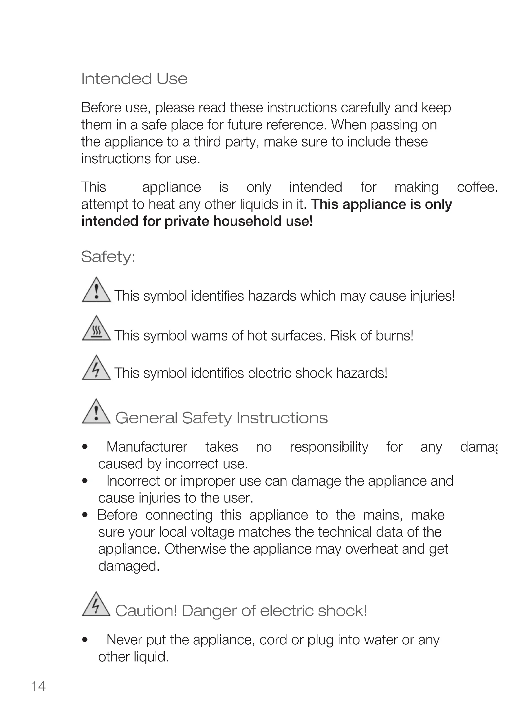 - Before connecting this appliance to the mains, make sure your local voltage matches the technical data of the appliance. Otherwise the appliance may overheat and get damaged. Caution! Danger of electric shock!