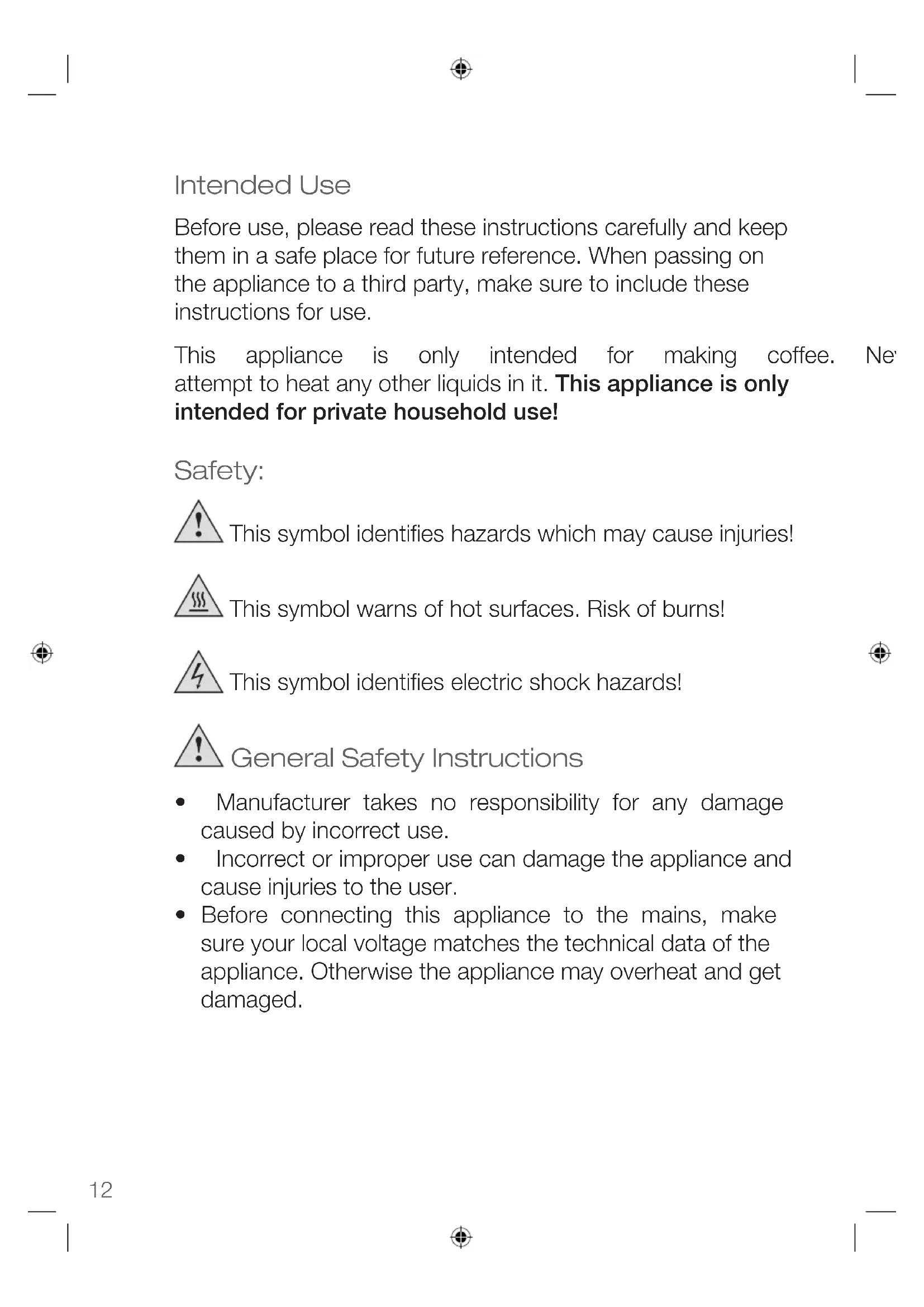 Disposal Instructions Waste electrical devices marked with this sign must not be disposed of with your household waste, but are to be collected separately. Therefore, please return this device at the end of its life cycle to special collection points for disposal or your local dealer. Your2-Cup Coffee Maker 12207/12208 is packed in a retail box. Such boxes are recyclable waste, i.e. they are reusable or recyclable.22 Technical Data: Voltage: 220-240V~50/60Hz RatedPower: 420-500W ProtectionClass: I Technical data subject to change!Instruction Manual ENGLISH