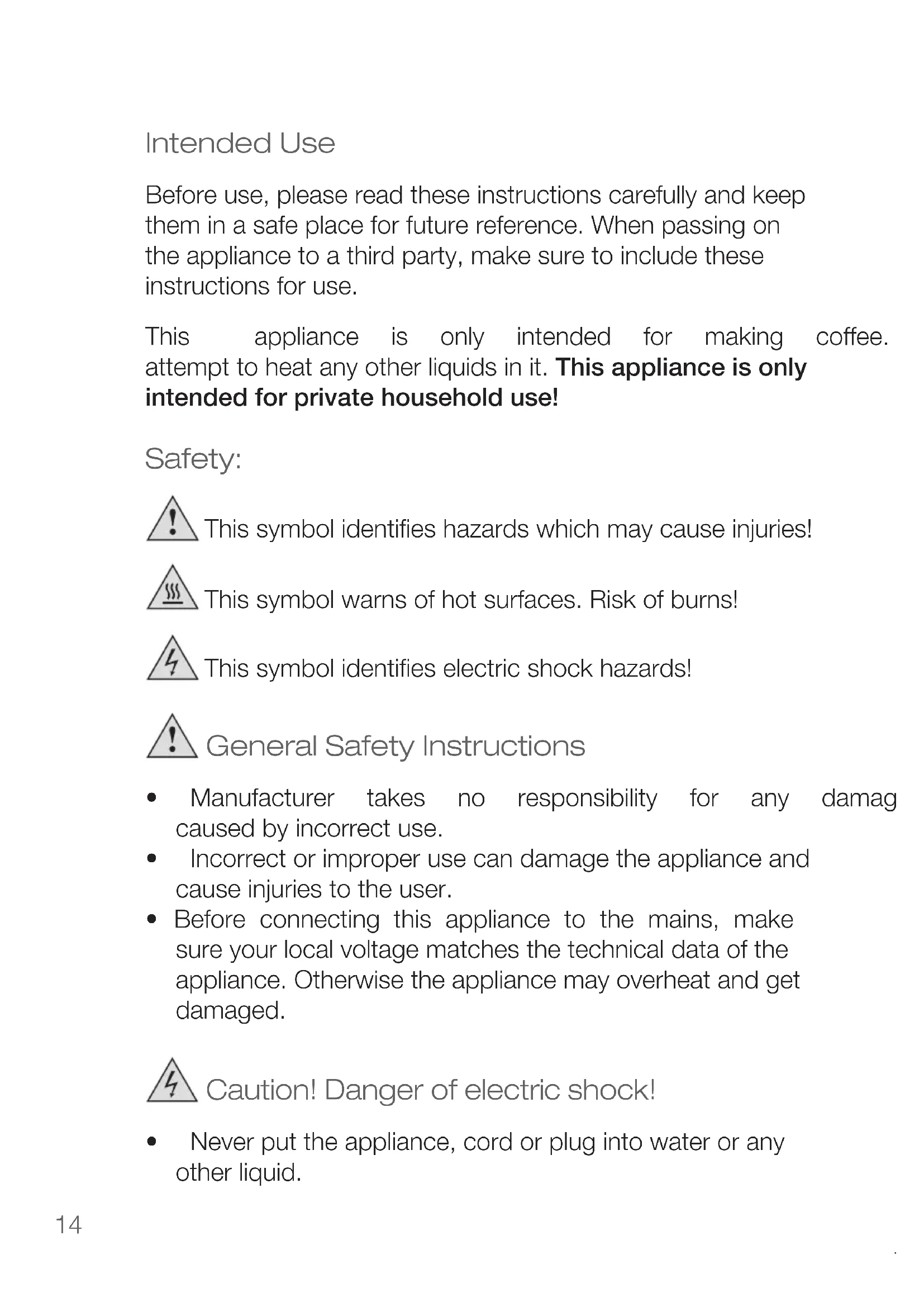 - Never open the filter cover or the filter holder respectively during operation, hot steam evaporates. Danger of serious burns!