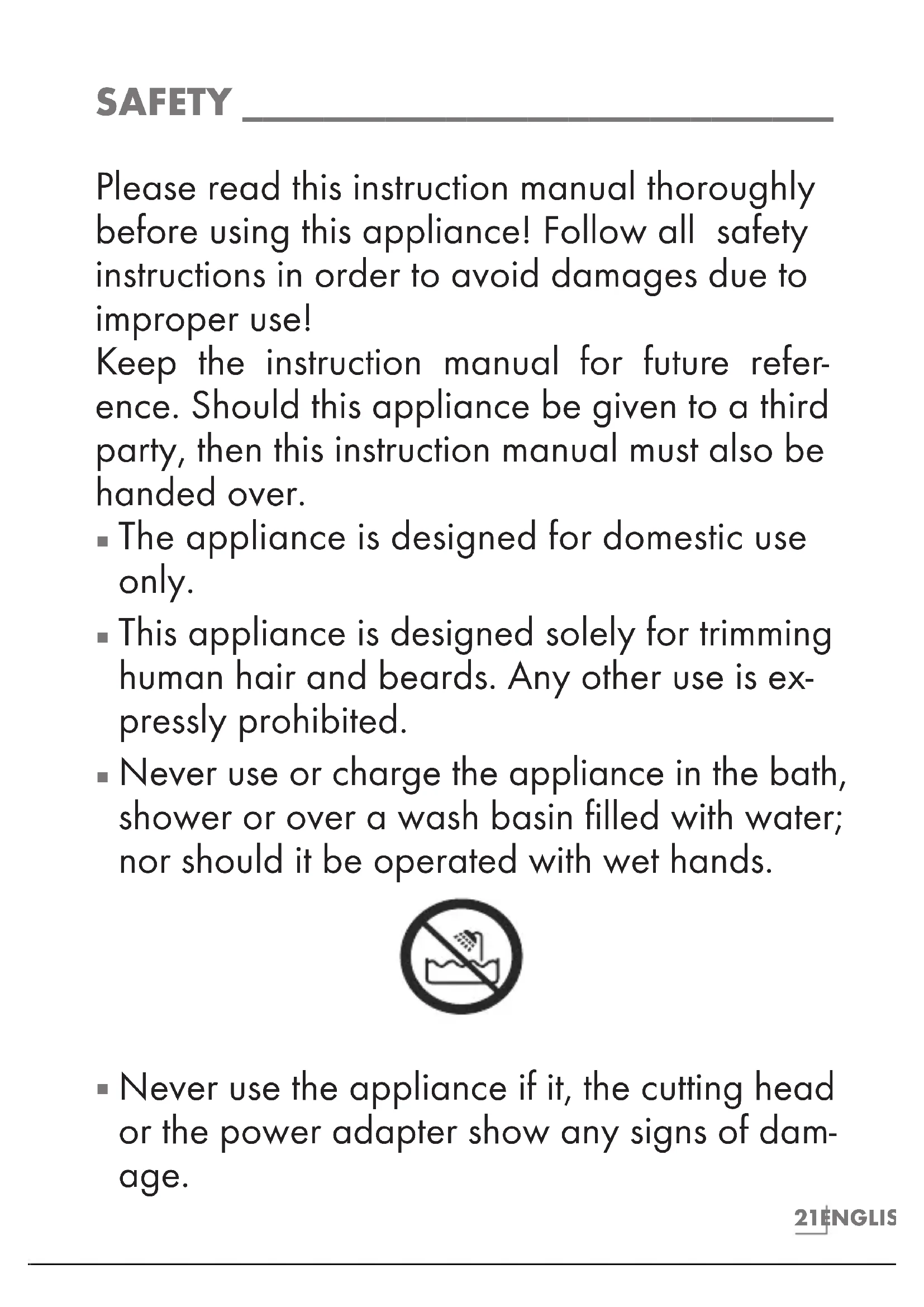 This appliance is designed solely for trimming human hair and beards. Any other use is ex- pressly prohibited.