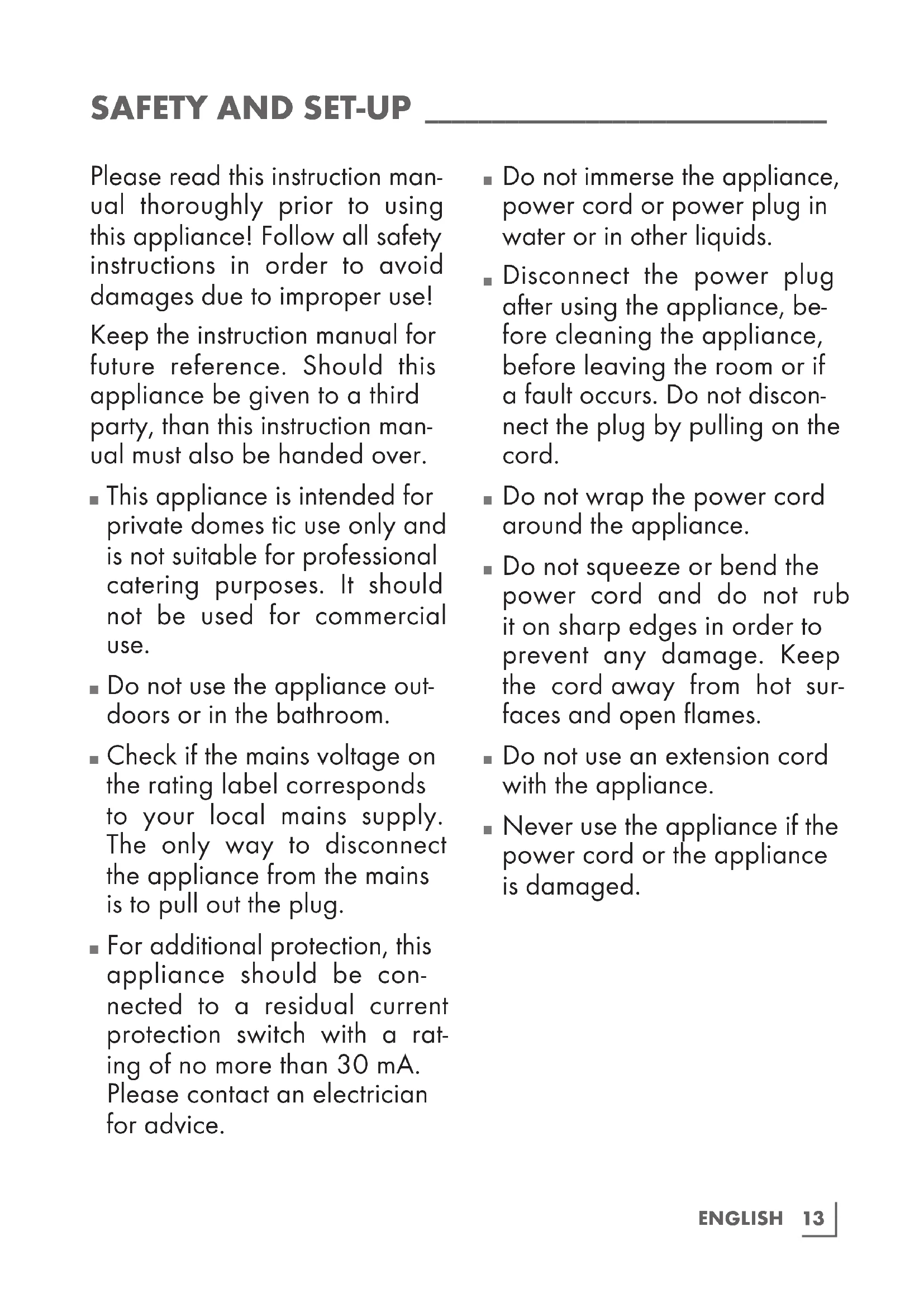 Please read this instruction man- ual thoroughly prior to using this appliance! Follow all safety instructions in order to avoid damages due to improper use! Keep the instruction manual for future reference. Should this appliance be given to a third party, than this instruction man- ual must also be handed over.